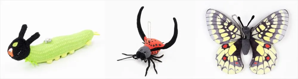 オリジナルグッズには、ぬいぐるみやピンバッジ、文房具、グミなど幅広い商品がラインナップ。ムシの特徴を捉え、細部まで再現したぬいぐるみには、オオセンチコガネ、クロコノマチョウの幼虫、オオナガトゲグモ、ウスバキチョウなどが並ぶ。