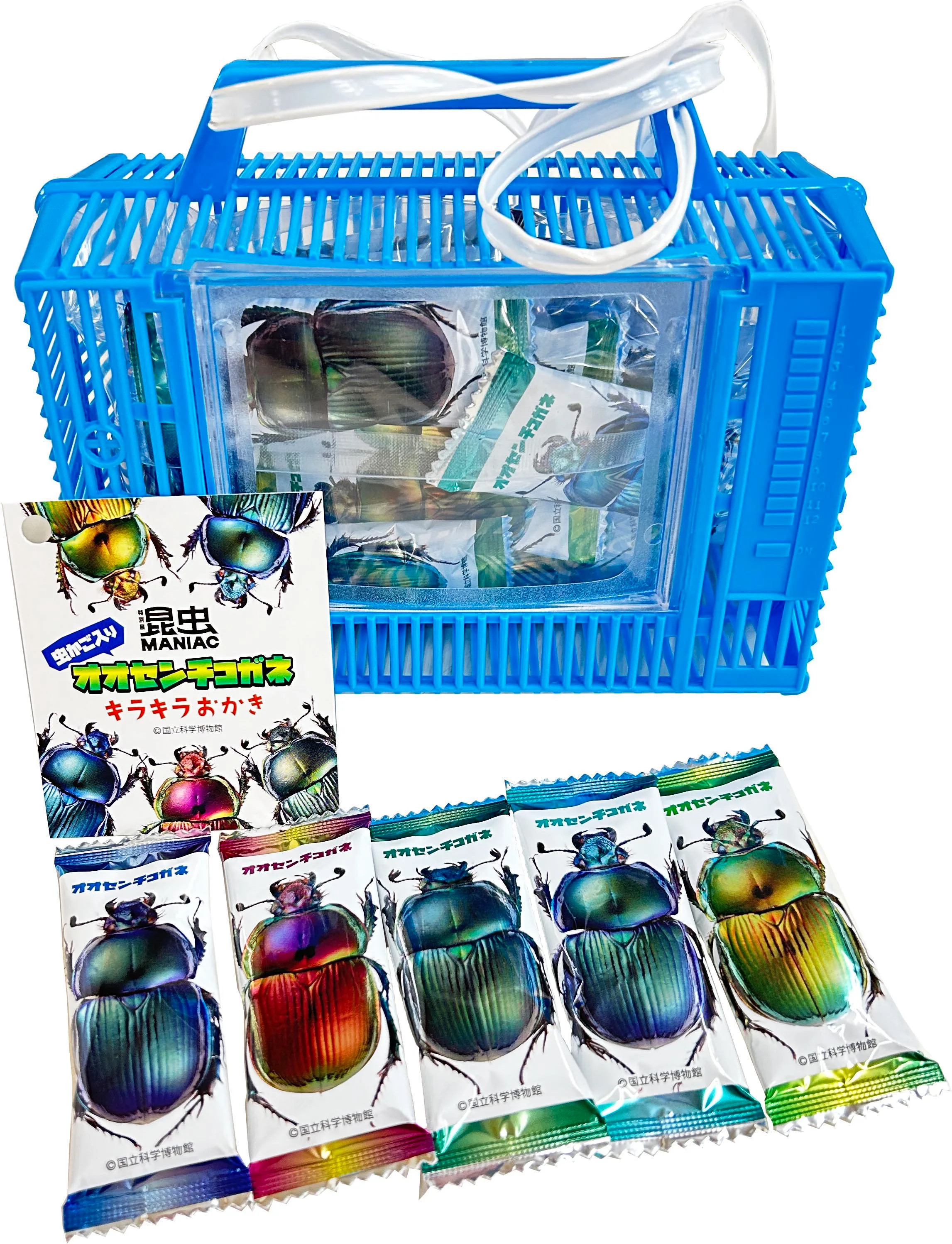 またお土産にぴったりのオリジナルお菓子として、昆虫のシルエットがプリントされたクッキーや、蒸しチョコケーキの「ムシむしパン」、コーラシロップキットの「クラフトスパイシー甲ラ(コーラ)」、アブラムシの甘露をイメージした「アブラムシのあめだま」、青虫の形をした「青虫グミ」、醤油味のおかきが虫かごの中に入った「虫かごキラキラおかき」など、バラエティーに富んだ商品が登場する。