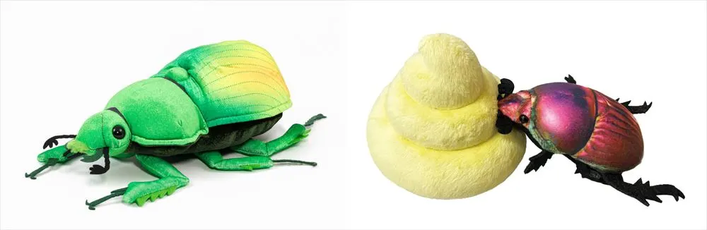 左:ぬいぐるみ(オオセンチコガネ)、右:オオセンチコガネブルブルぬいぐるみ