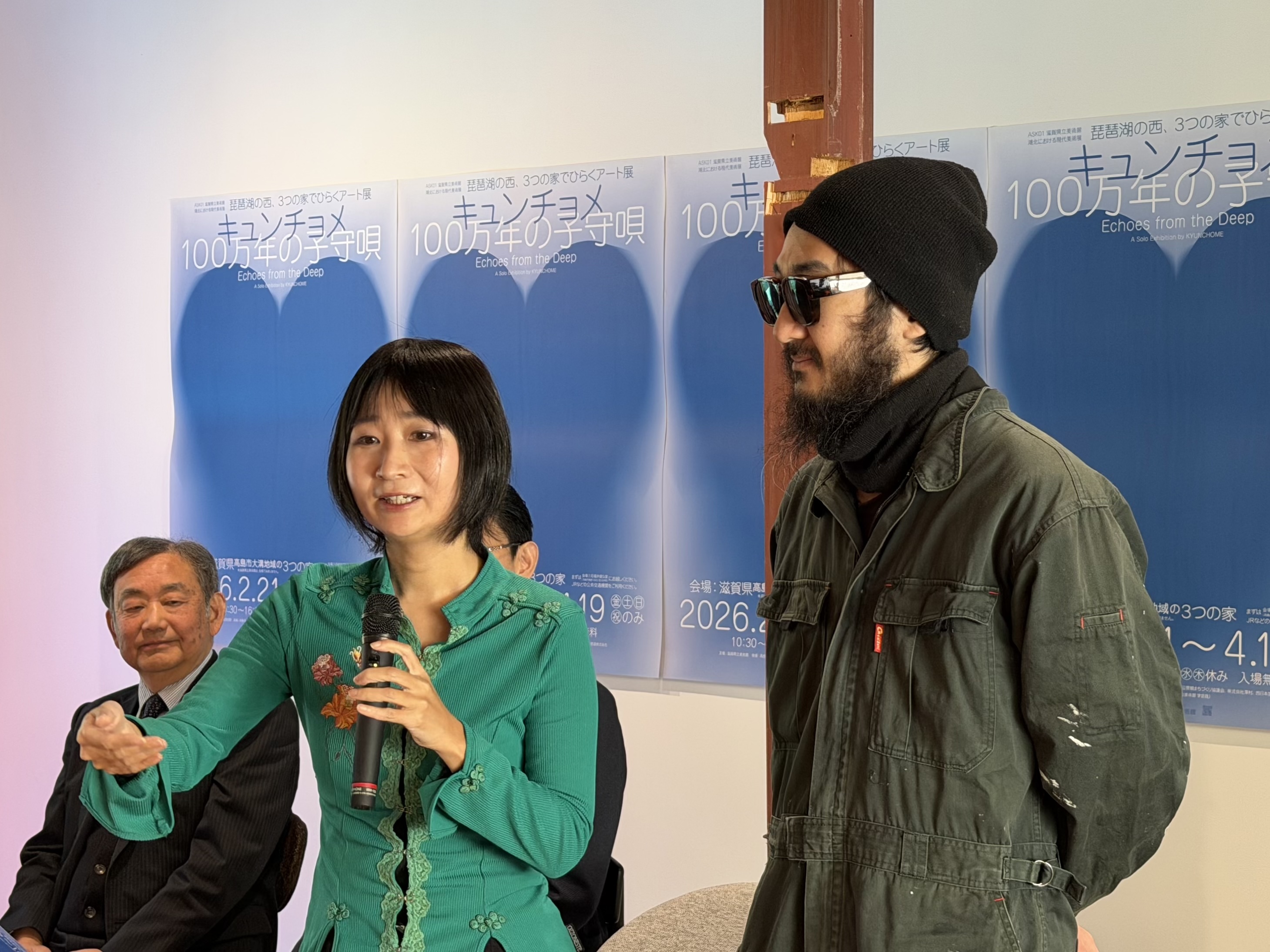 展覧会タイトルである「100万年の子守唄」は、古代湖・琵琶湖の悠久の時間と、水とともに暮らしてきた大溝の環境から着想を得ている。キュンチョメは初めてこの地を訪れた際、「町全体に張り巡らされた溝がすべて水路だとわかって、ここは水に抱擁される場所だと思った」と語る。さらに山から流れてきた水が琵琶湖へ集まる様子を見つめながら、「いろんなところからやってきたものが最終的にここに集まるように感じた」とこの町の特性について話した。