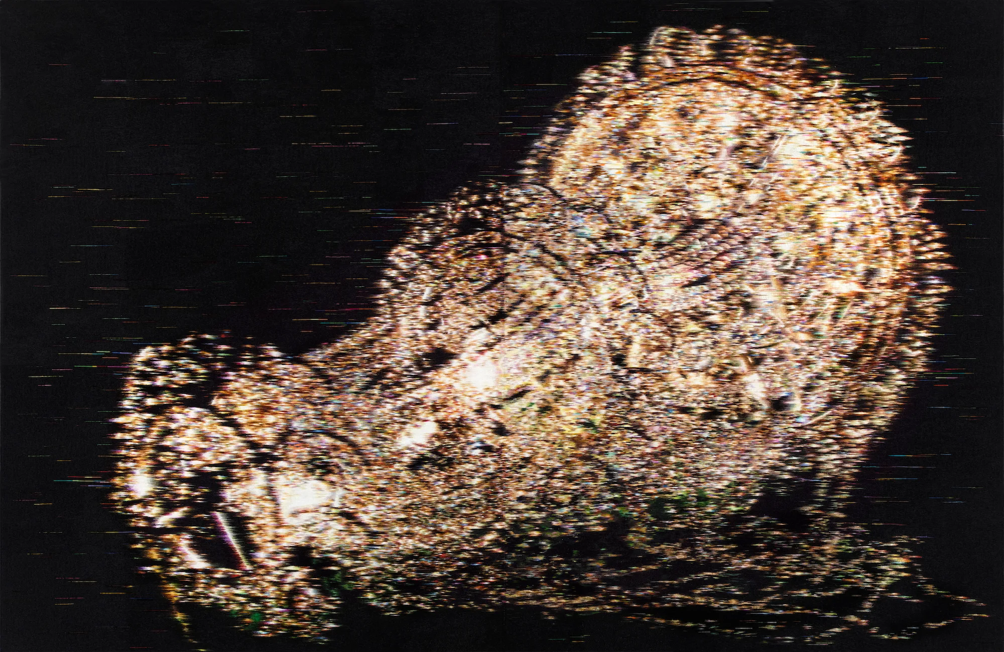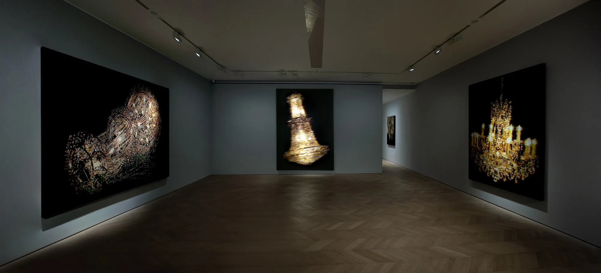 これは別のシリーズの話なのですが、私の別の代表作「シャンデリア」シリーズの着想は、北朝鮮のアリラン・フェスティバルという祭りの様子を追ったドキュメンタリーをみたことにあります。その祭りでは、何百人もの子供たちが小さな色付きの紙を持ち、それらを一斉に掲げることによって、集団でひとつの図柄を表現するというプロパガンダ・アートが行われていました。その時に表現されていたのは、銃の図柄でした。私は、色紙を持った子供たちのなかに、ひとりの男の子を見つけました。ほんの一瞬、彼は手に持っていた色紙を取り落としかけ、その顔が集団のなかでちらりと見えたのです。彼は驚いて大急ぎで色紙を元の場所に持ち直しましたが、その一連の様子は私にとってとてもショッキングなものでした。まるでひとりの少年が、プロパガンダ用の画像、しかも銃の画像を作るためのピクセルのうちのひとつになってしまったように感じたからです。