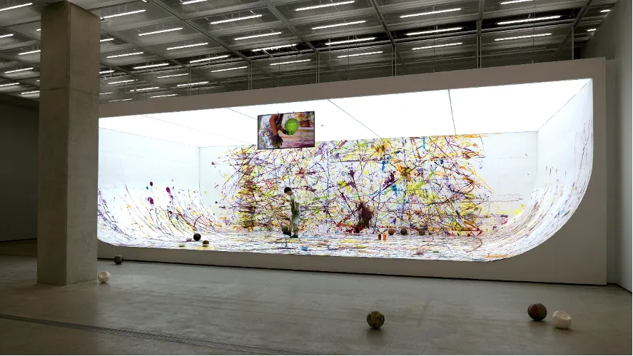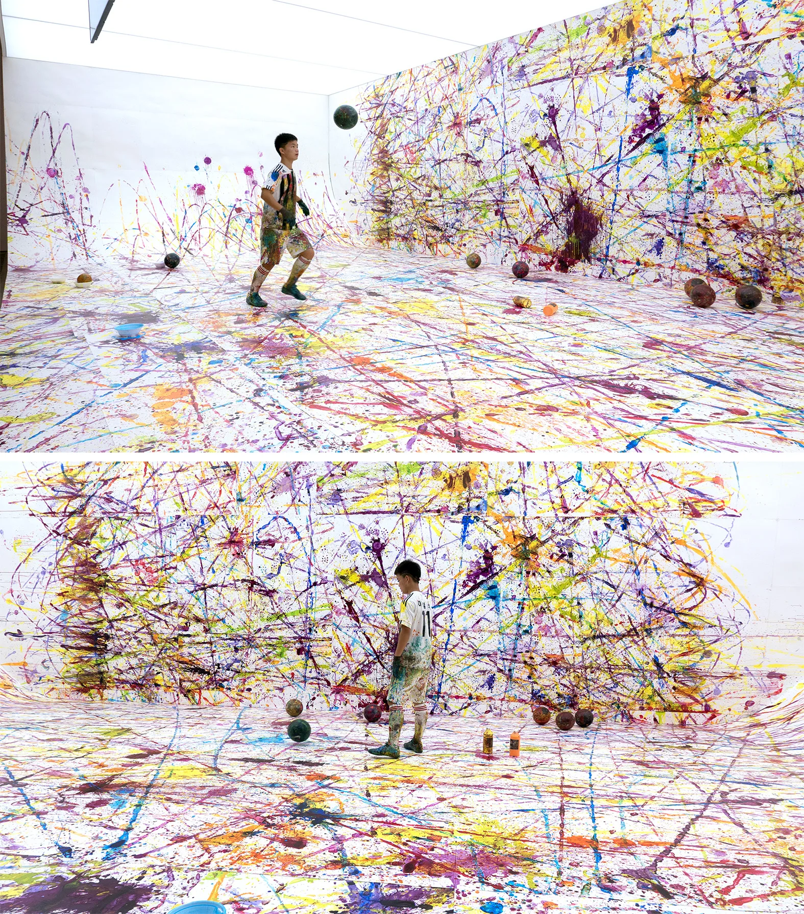 たとえば、《Soccer Painting by the Soccer Ball Bouncing Over Crocodile River》(2016)では、真っ白な舞台を用意し、そこである少年にサッカーボールを蹴ってもらいました。この少年は、9歳のときに自力で北朝鮮から韓国へと亡命してきたのですが、いまでは韓国でサッカーに熱中しているのです。サッカーボールにはアクリル絵具が塗ってあり、彼が舞台上でボールを蹴る度に周囲に絵具が散らばります。私はその少年に、「北朝鮮から逃げてきたときのこと、あなたがぶつかった困難を考えながら思い切りボールを蹴ってみてください」とお願いし、その様子をビデオに記録しました。彼が蹴ったボールの痕跡によって生まれた作品に「クロコダイル川」の名前を付けています。タイにあるこの川は、少年が脱北する際に渡ってきた川です。彼が渾身の思いを込めてサッカーボールが残した絵具の飛沫ひとつひとつが、彼の存在の証となり、闘いに明け暮れた彼自身の時間を物語る作品となりました(*1)。