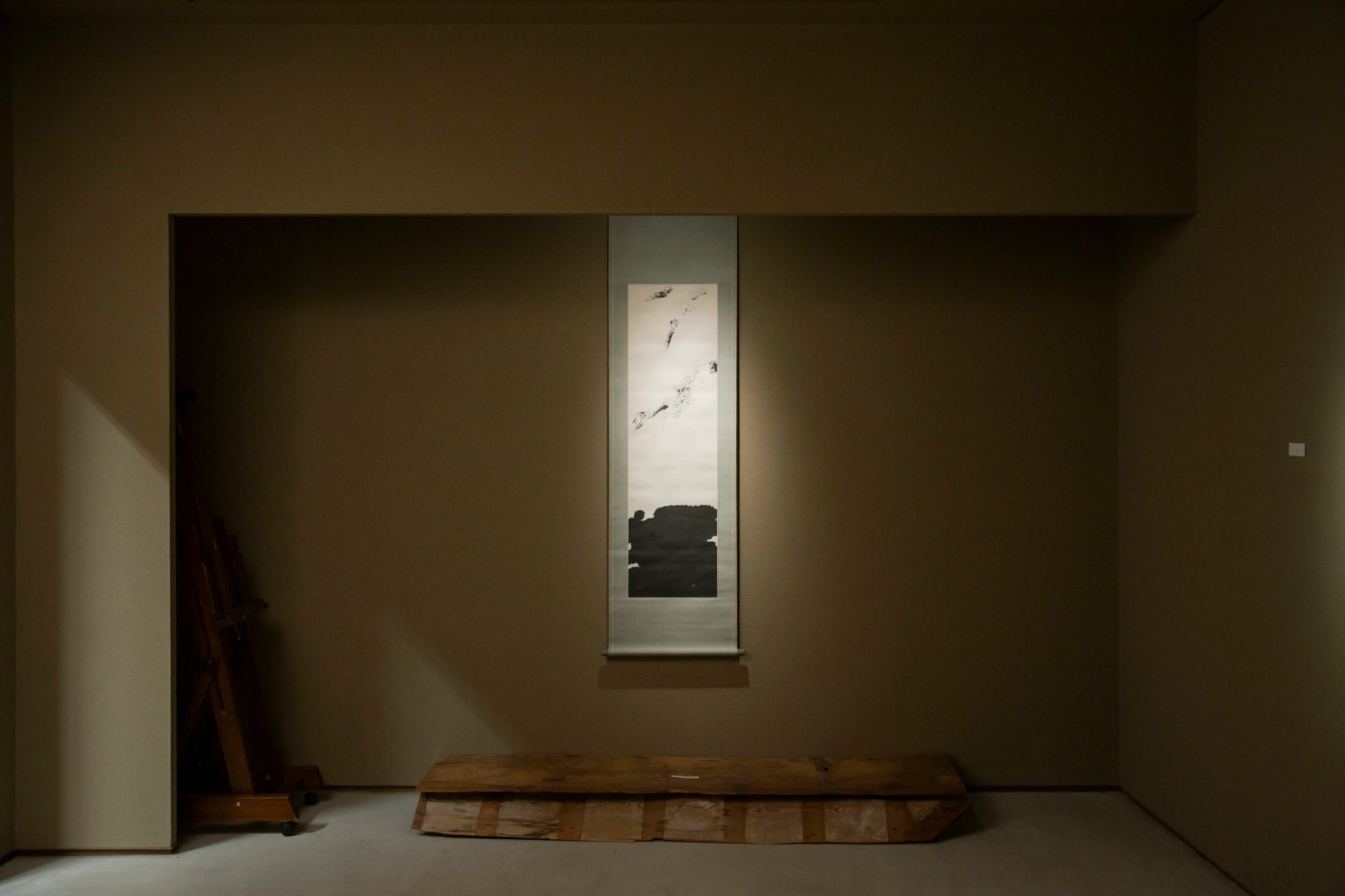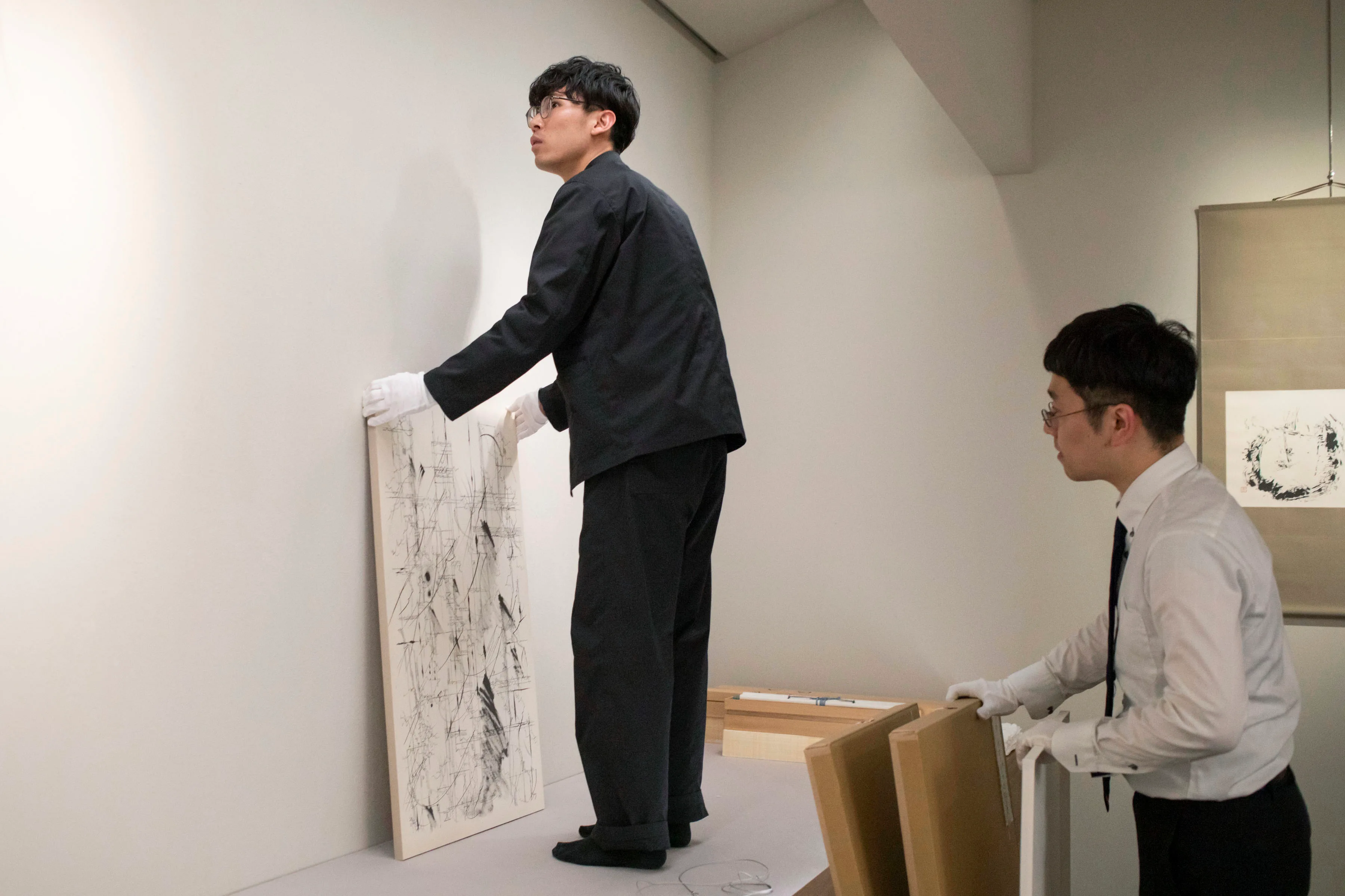 スタッフによって一点一点、眼と手で確かめながら作品が掛けられてゆく様子を見守った。余白をたっぷりとることで、作品の緊張感が和らぎ、同時代の作品を隣り合わせることで、制作当時の石川の思いが増幅されて伝わる。「展示のストーリーを考えるのが一番面白い」と、思文閣の山内徳太郎さん。
