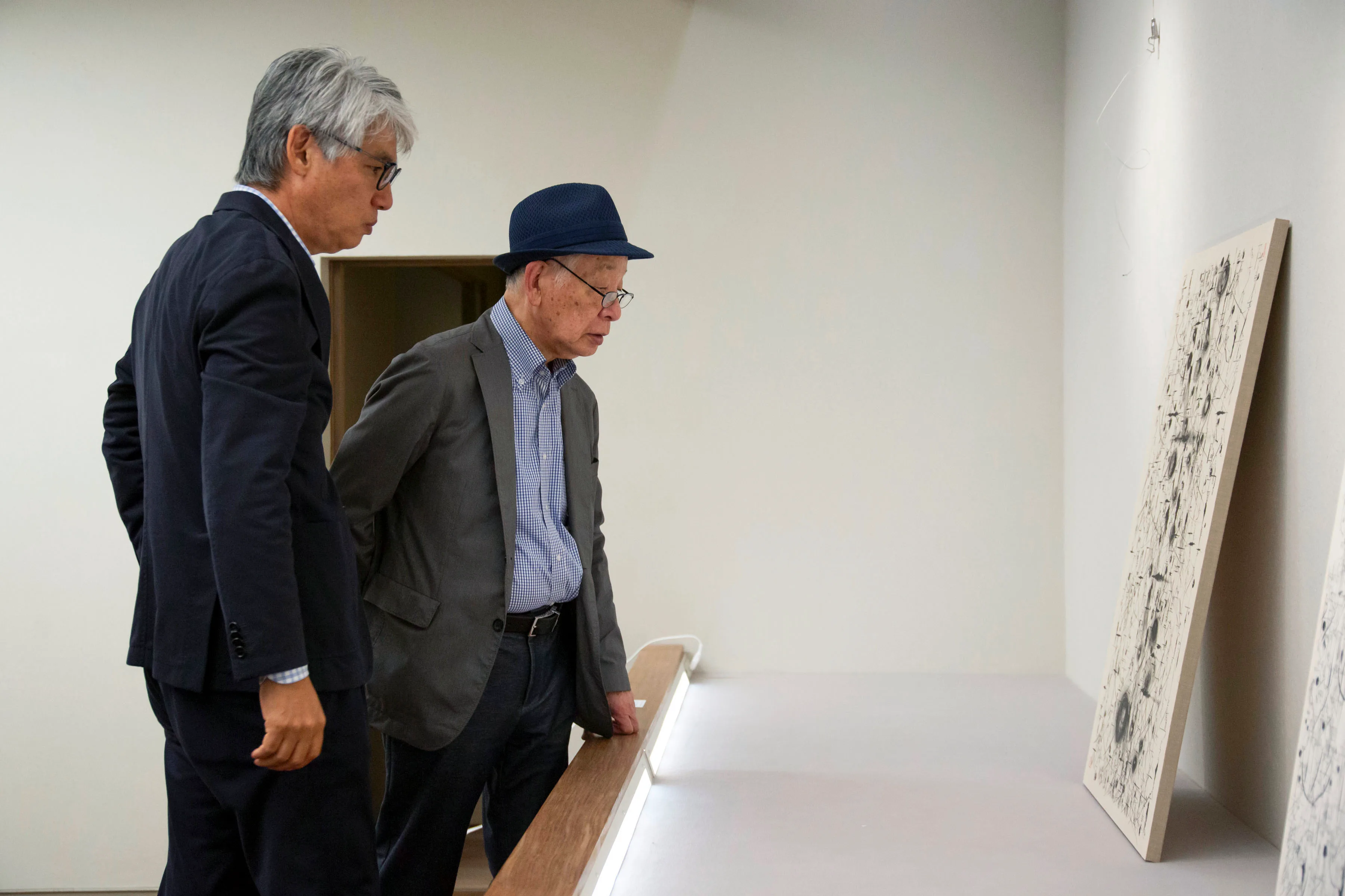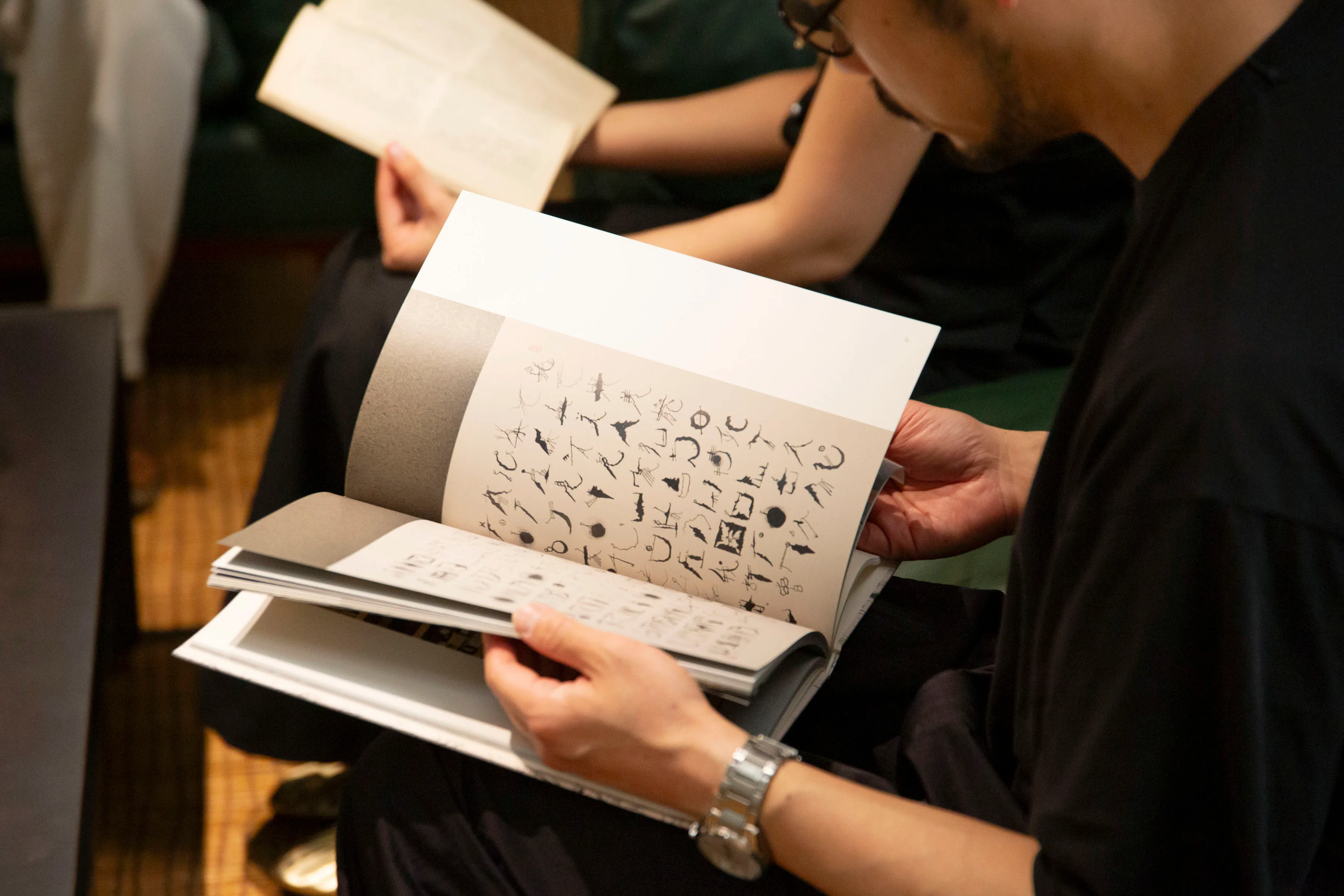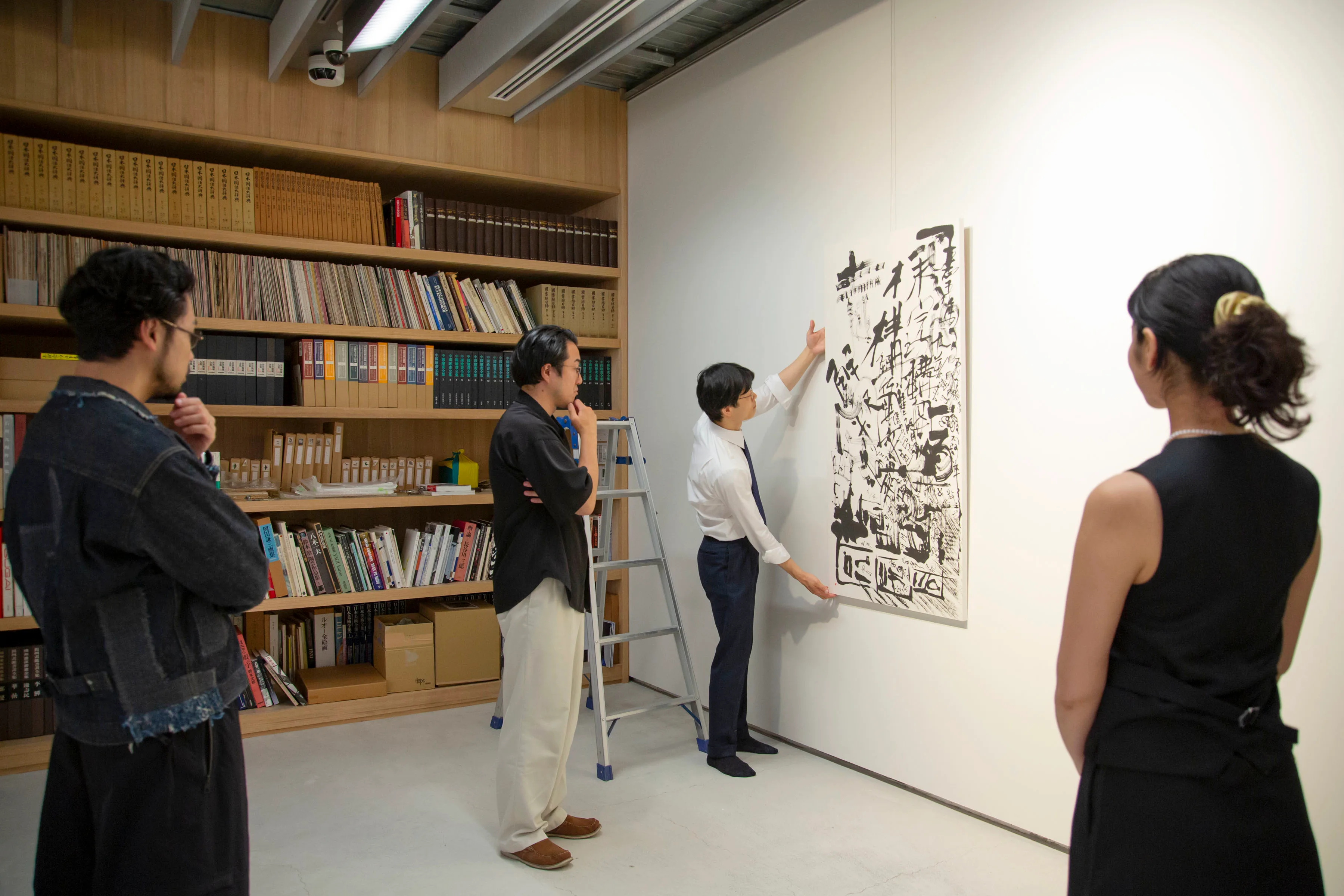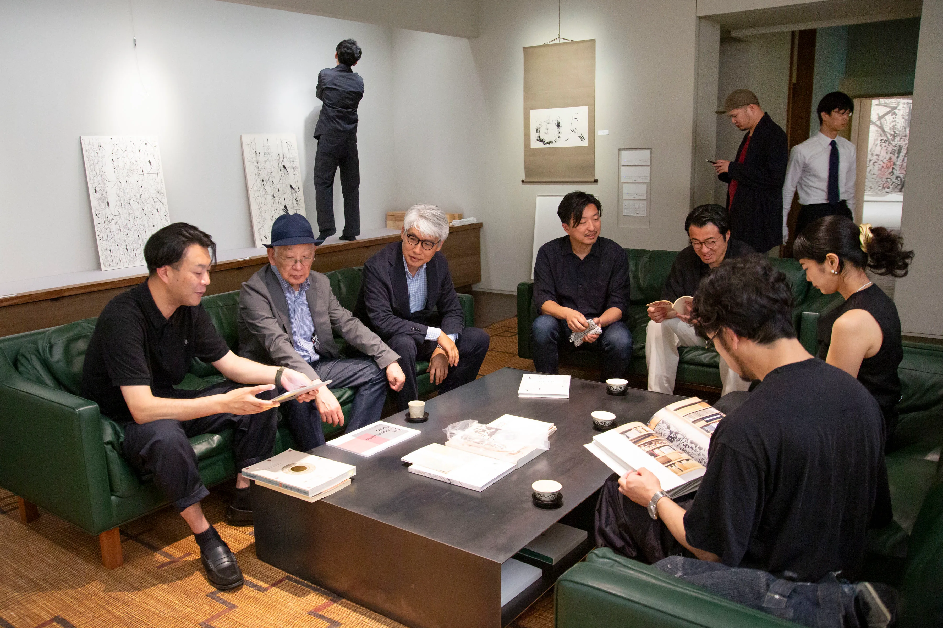 展示替えの日、各界で活躍するクリエイターが集まった。前後期の作品すべてを鑑賞できる日に、それぞれの視点から石川九楊の多様な解読を試みる。