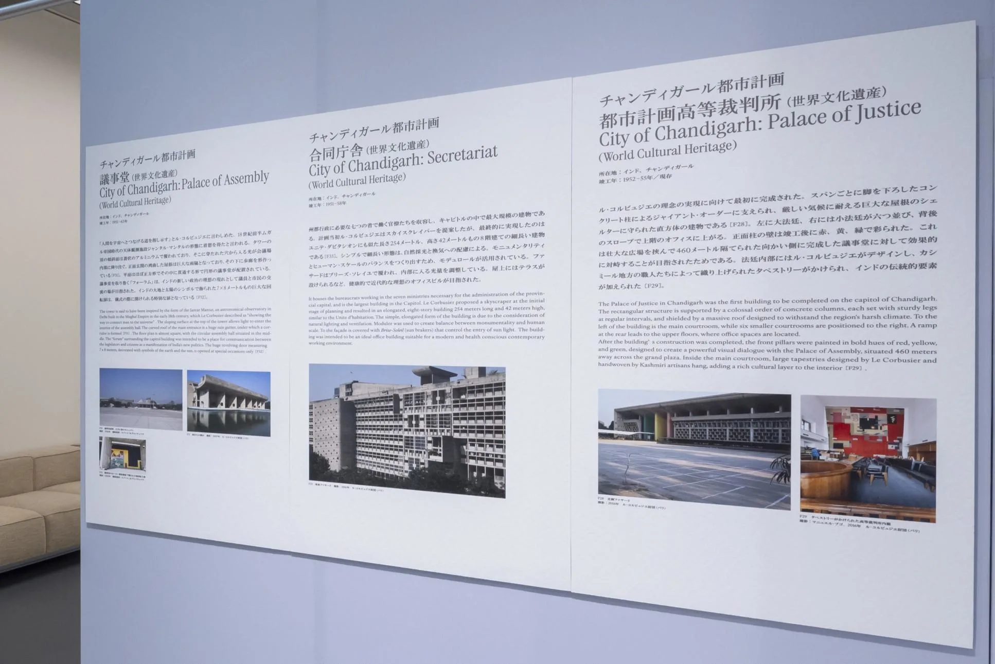 そして最後に、大きなスケールの作品ではインド・チャンディガールの政府地区の中心にある建物群はもっとも代表的な作品として挙げられるでしょう。それはおそらく彼の人生、芸術家としての人生の要約なのだと思います。本展のカタログにも寄稿しているウィリアム・J.R.カーティス(歴史家、評論家、キュレーター、画家、写真家)は、かつてチャンディガールの様子を政治的かつ宇宙的な風景と表現しましたが、私も20世紀後半におけるもっとも記念碑的な建築群であると思います。ル・コルビュジエの円熟期の特徴が盛り込まれた建築群は、建築の枠組みを超えた、深い詩的空間でもあると言えます。