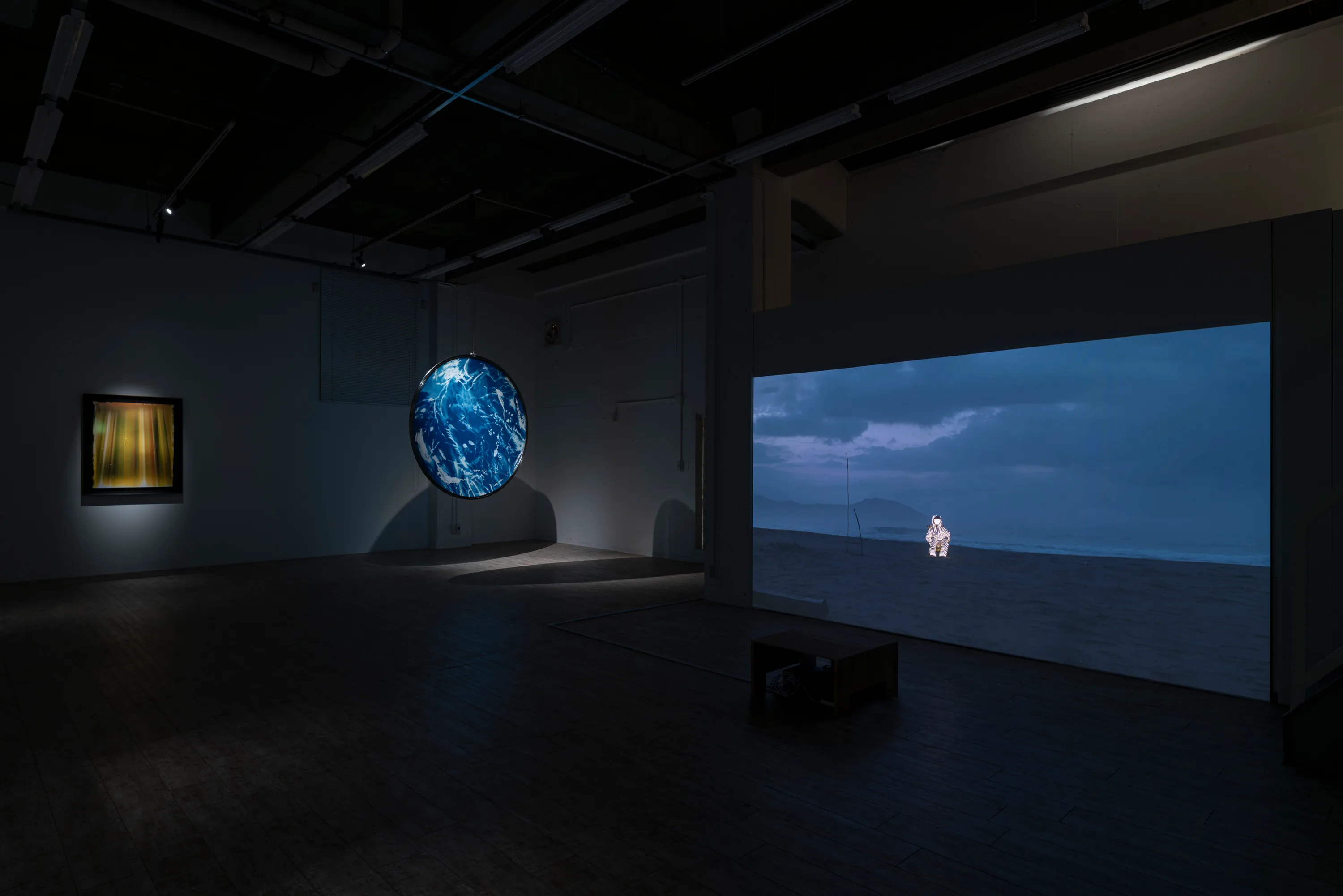 もうひとつの会場、天井の高い開放的なカフェ、hatoba cafeでは、3人のアーティストによるグループ展「光リフレクション」が開催された。小松千倫の作品は、LEDを取り付けたコスチュームを着て、海岸沿いで自然光と人工光が作り出す光と影を観測する映像。外山リョウスケは、自作のピンホールカメラを用いた独自の写真技法Tempusgraphを用いて、時間の可視化を試みる。染織を中心に作品を展開する山本愛子は、日光で感光させるサイアノタイプを用い、近辺で採集した雑草などのシルエットを写し出し、この地域に流れる時間を布に染み込ませた。3人3様の「光」へのアプローチが、暗闇の中で共鳴する。