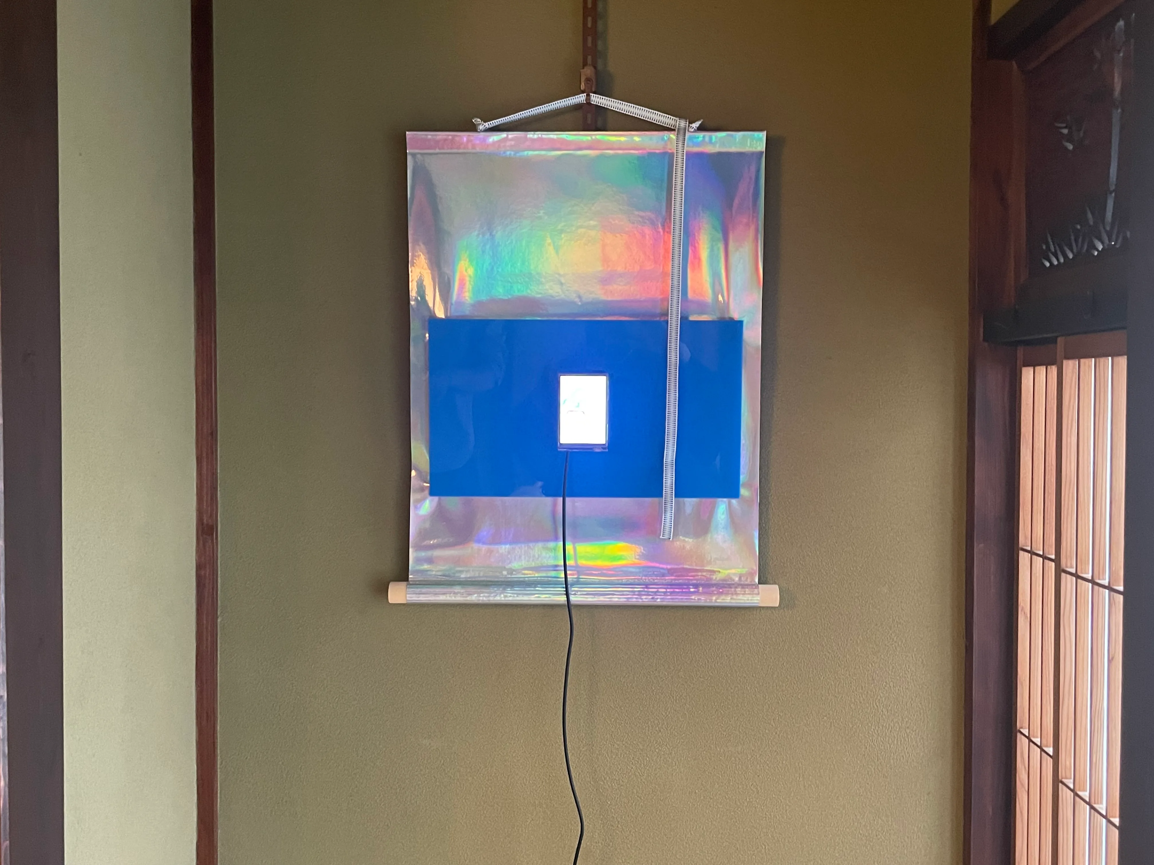 京都の五花街、宮川町のお茶屋を、コワーキングスペースとしてリノベーションしたサイツキョウトに登場するのは、彌永ゆり子による、デジタルイメージのユニークなプレゼンテーション。床の間には、徐々に絵が生成されてゆく小さなモニタがあり、書院障子から入る明かりが刻々と変化するのとシンクロして描画が進む。ビニールと電子基盤を組み合わせたオブジェもあるが、手作業の跡を感じさせる作品は、築100年を超える贅を尽くした木造建築と不思議な寄り添い方をしている。