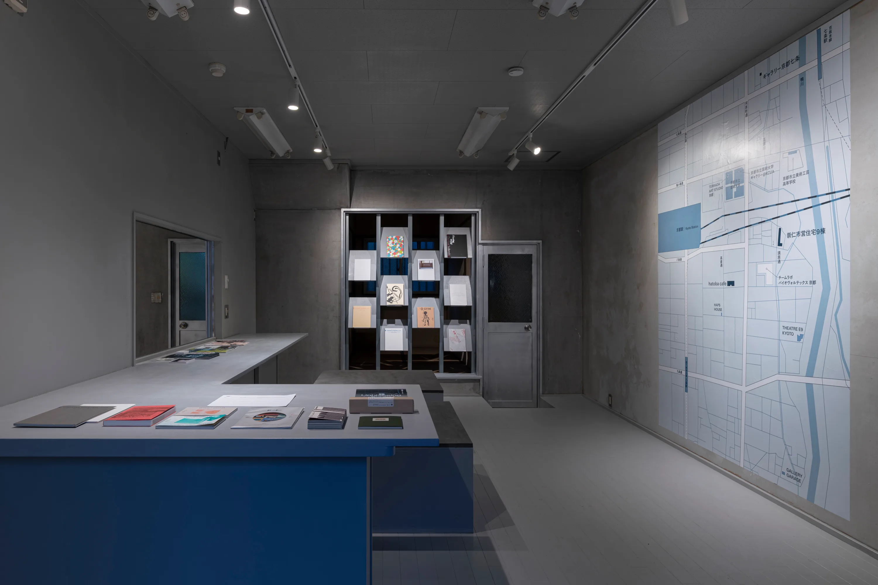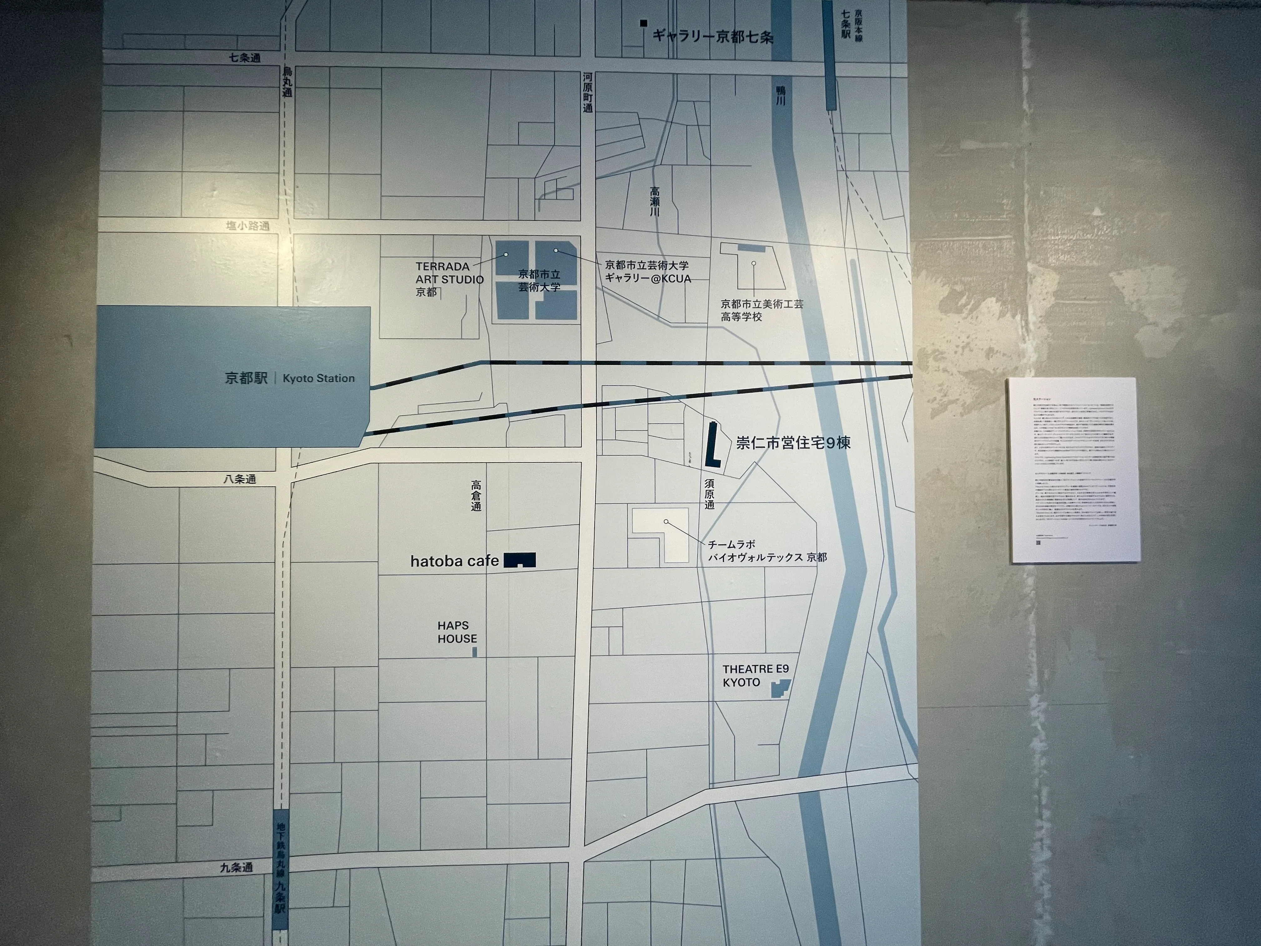 崇仁市営住宅9棟の空き店舗だった場所をリノベーションして、インフォメーションセンターを含む3つの展示場が作られた。大きな地図が掲示され、この地図上に、地元での発見や交流を書き込んで蓄積してゆくことが想定されている。地元の人たちの憩いの場だった元喫茶店のスペースでは、近隣の住民が立ち寄り、コーヒーを片手にスタッフと会話する光景も見られた。