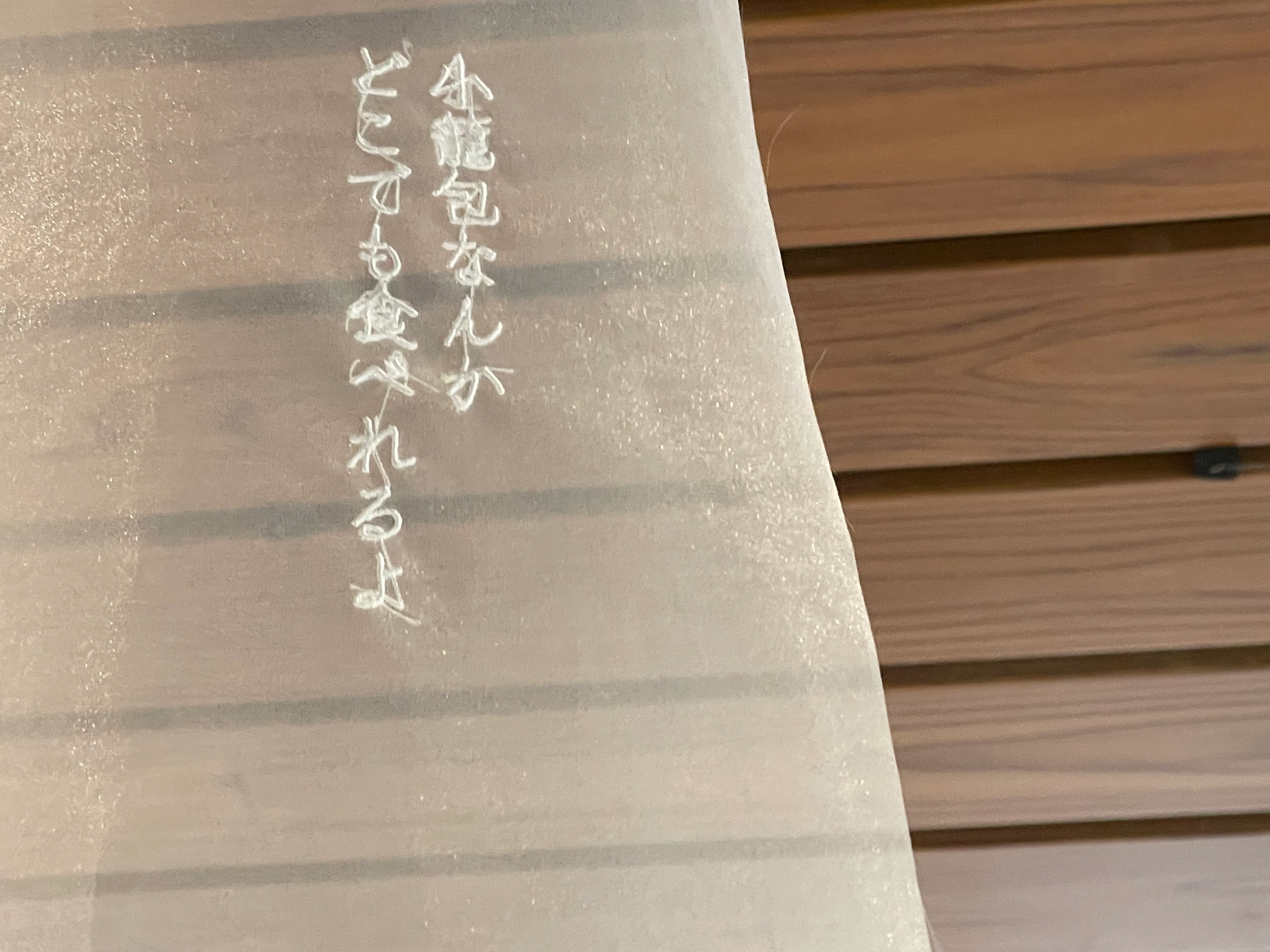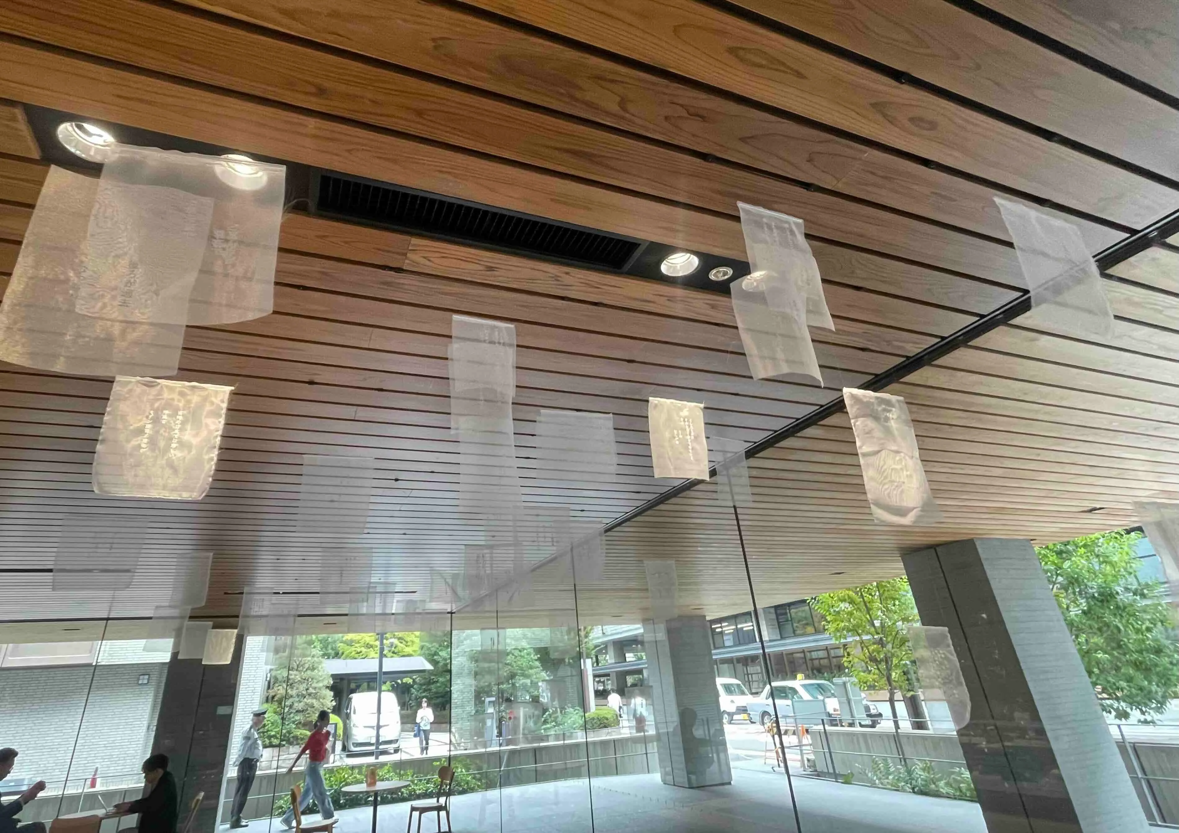 2025年に竣工された、京都市役所の新庁舎、分庁舎も展示会場に。本庁舎は武田五一による歴史的価値ある建物だが、新しい庁舎はバリアフリーの開放的な空間だ。ここには、小林颯太の作品が展示される。軽く半透明のオーガンジーの生地に刺繍された言葉は、街中で聞こえてくる会話の断片。自然光が降り注ぐ空間の中、風に揺れる言葉たちもまた、環境の一部であり、都市の息遣いだと感じられる。