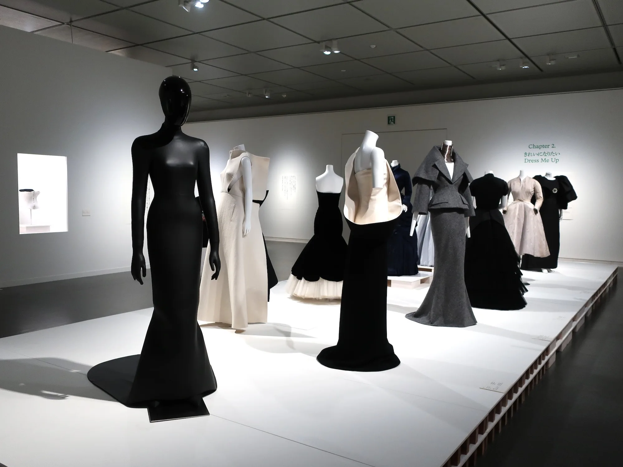 続くChapter 2「きれいになりたい」でも、美への情熱と欲望、執着と狂気性が、紙一重であることを考えずにはいられない。顔より大振りな袖、コルセットによって締め上げられたウエスト、歩けないほど広がったスカートや高さのあるヒールレスシューズなど、美しいフォルムを追い求めた様々な衣服や小物が並ぶ。