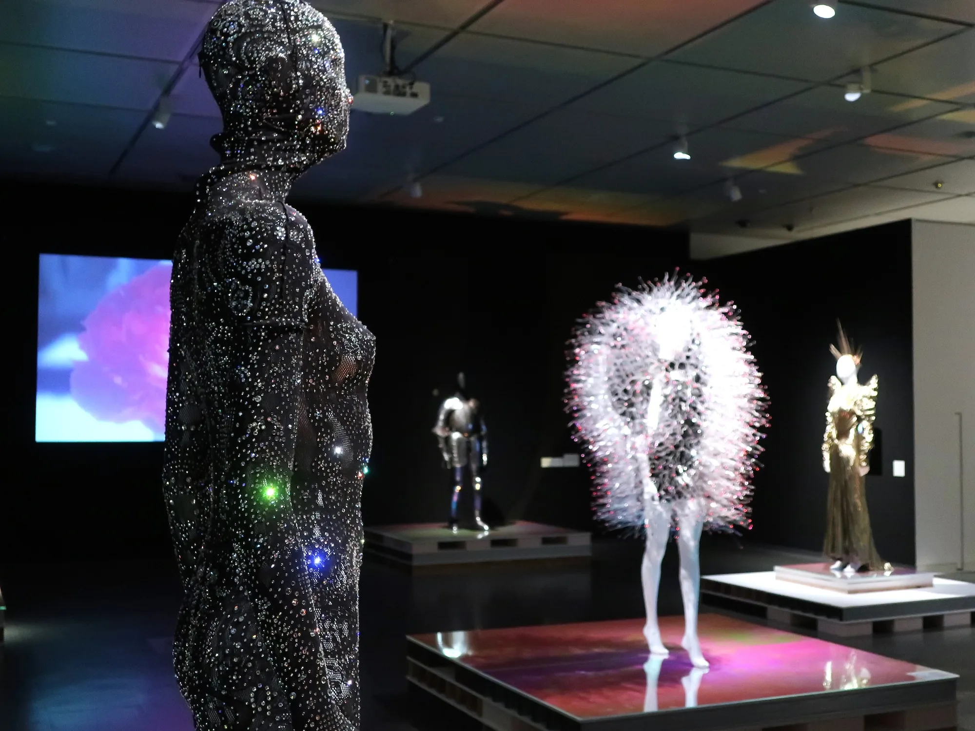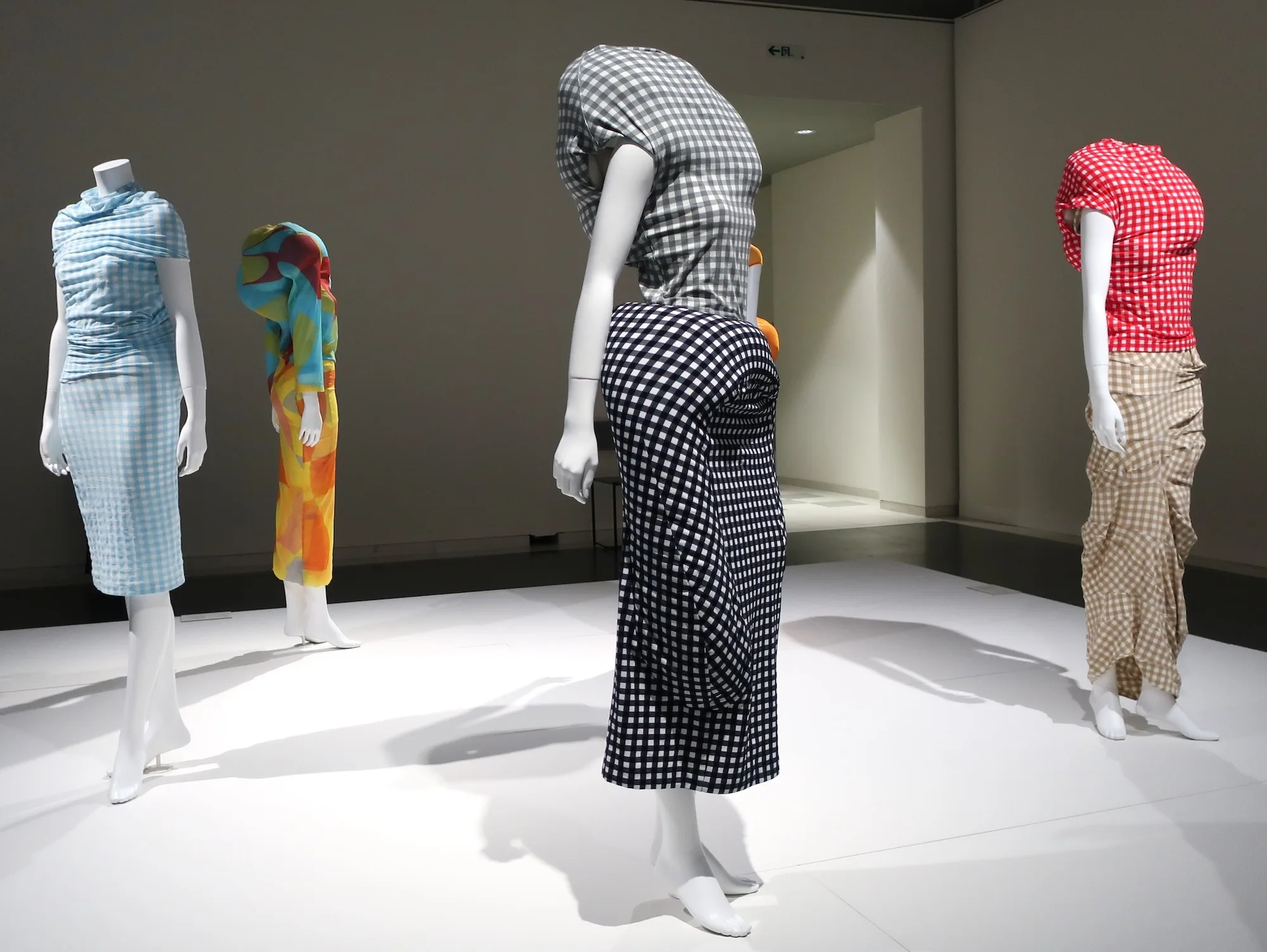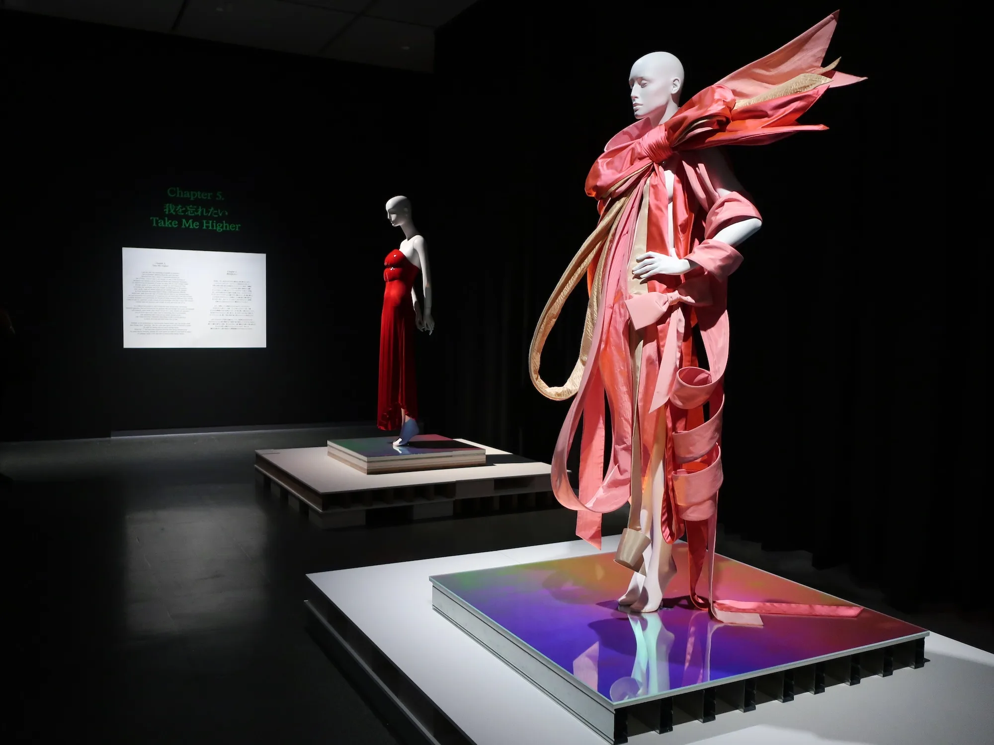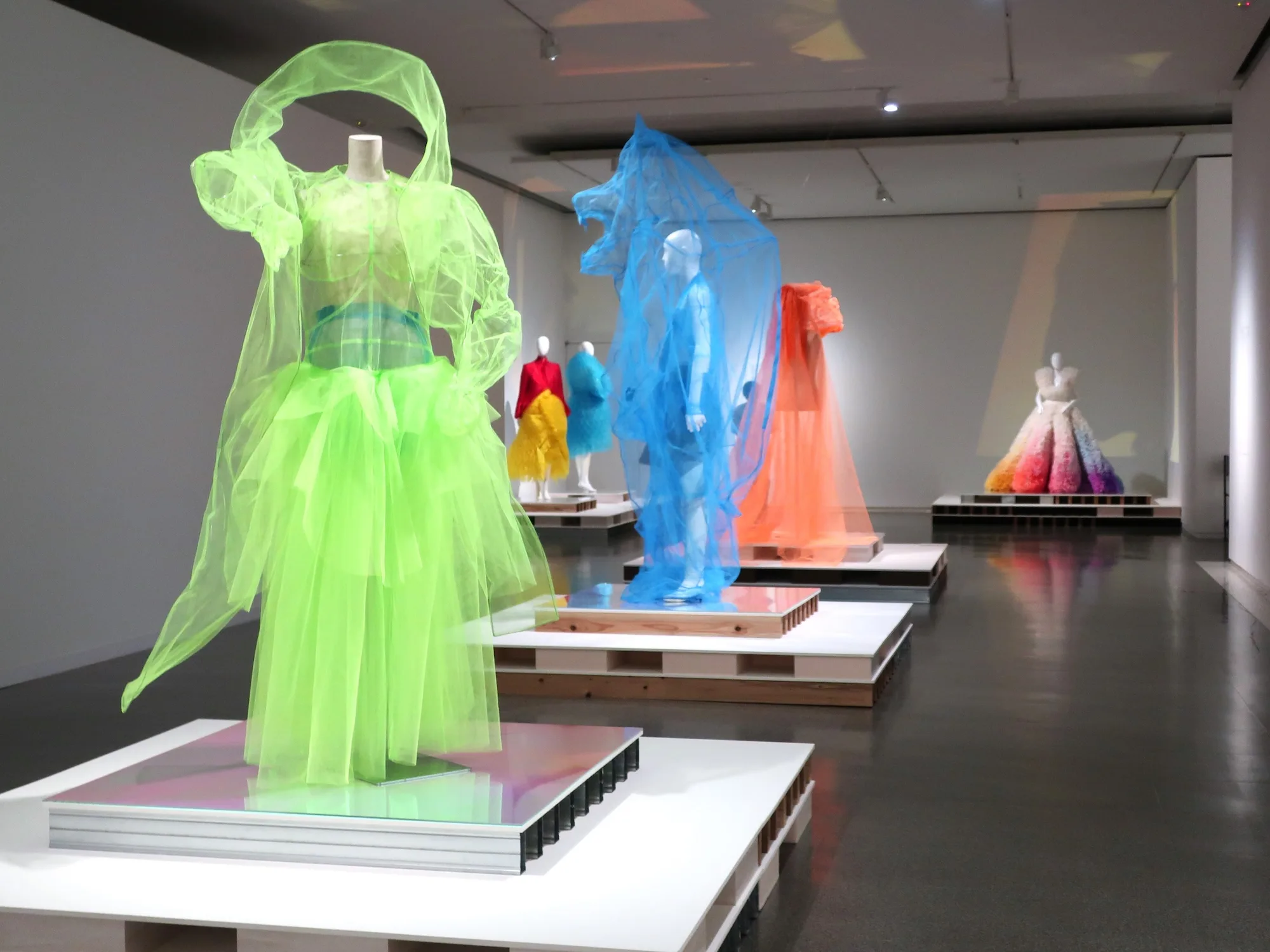 コレクション展を行う上階へ続く展示は、カラフルなチュール素材が身体を覆う「Yoshio Kubo(ヨシオクボ/久保嘉男)」のルックや、ふわふわとしたポリエステル・オーガンジーでできた「Tomo Koizumi(トモ・コイズミ/小泉智貴)」のドレスなどと、原田裕規のヴィデオインスタレーションによって幕を閉じる。