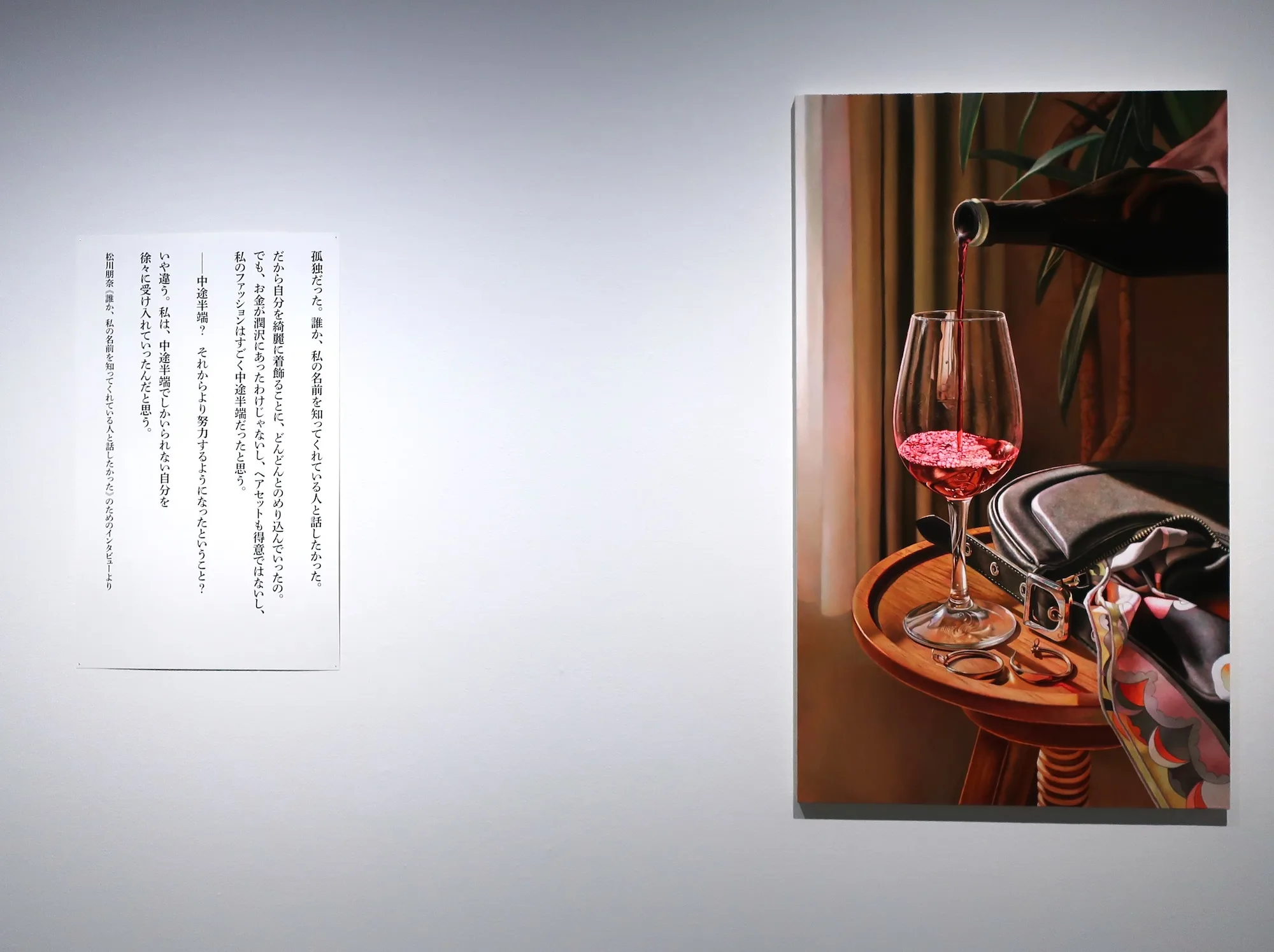 また、同世代の女性たちのインタビューを題材に、彼女たちの日常や内面を写実的に描き出す松川朋奈の絵画は、年齢とともに属性が変化するなかで、「ありのままの自分」とは、「ありのままに生きる」とは何かを問いかけているように見える。