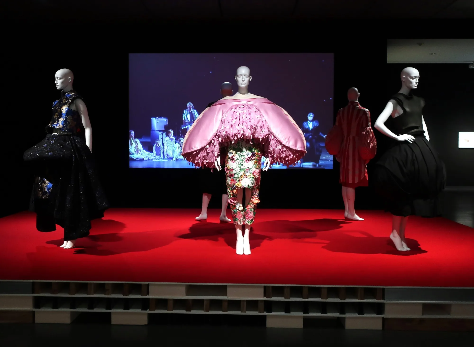 白を基調にした空間から一転、Chapter 4「自由になりたい」では、黒の空間に6体のトルソーが登場。川久保玲が手がけた「Comme des Garçons」と「COMME des GARÇONS HOMME PLUS(コム・デ・ギャルソン オム・プリュス)」の2020年春夏コレクションのルックだ。背景のスクリーンには、川久保が初めて衣装デザインを担当した、ウィーン国立歌劇場でのオペラ作品『Orlando(オルランド)》(2019)のダイジェスト映像が流れる。