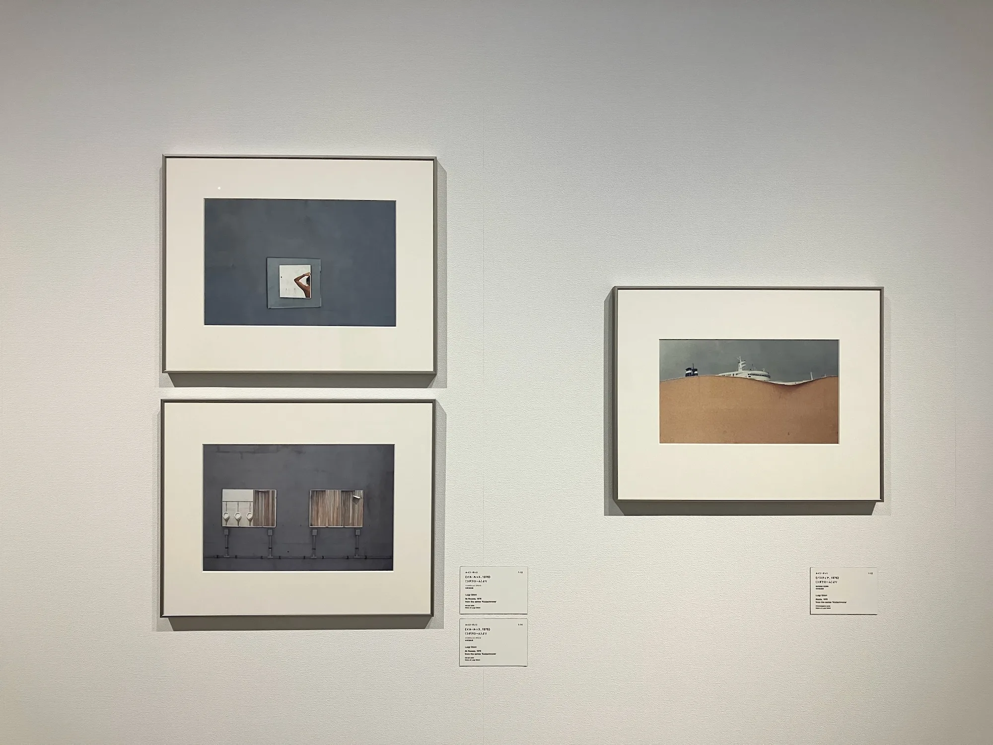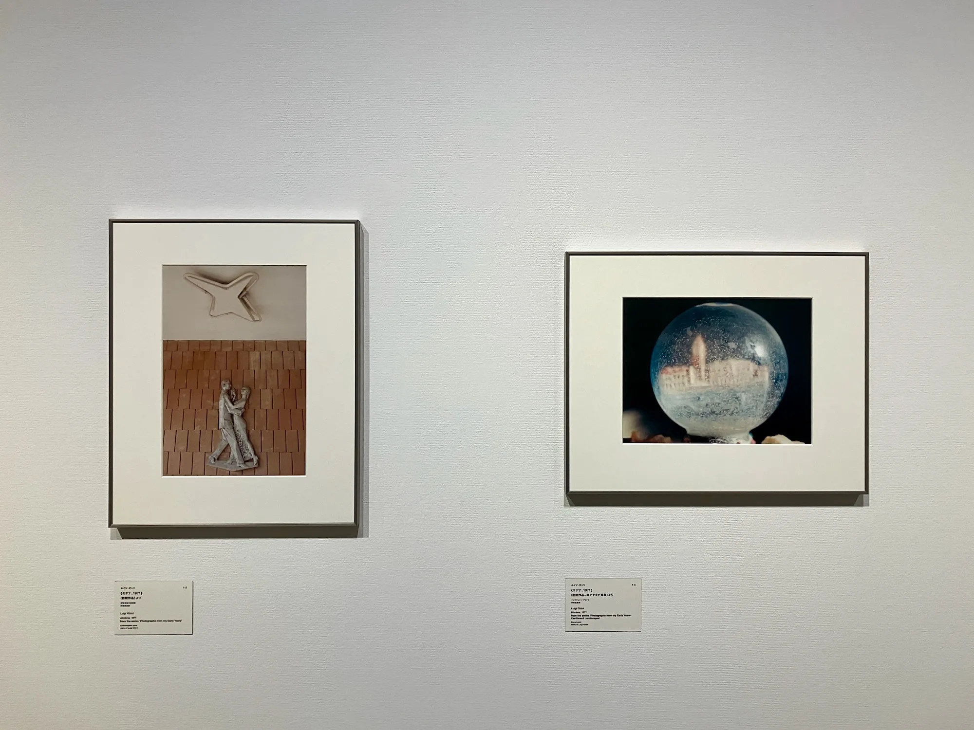 展覧会のふたつめのパート「オブジェクトとイメージ2:イメージと記憶の交差」では、ギッリのそうした平面化の試みが一歩進んで、1枚の写真の中に折り重なる複数のイメージが鑑賞者の記憶や想像の中で重層的に拡張される試みが提示される。たとえば、2枚の絵画を写した《モデナ、1975》の、額で隔てられた2枚の風景画を部分的に写すことによって生み出される遠近法のズレは、やはりキリコの絵画を彷彿とさせるものがある。