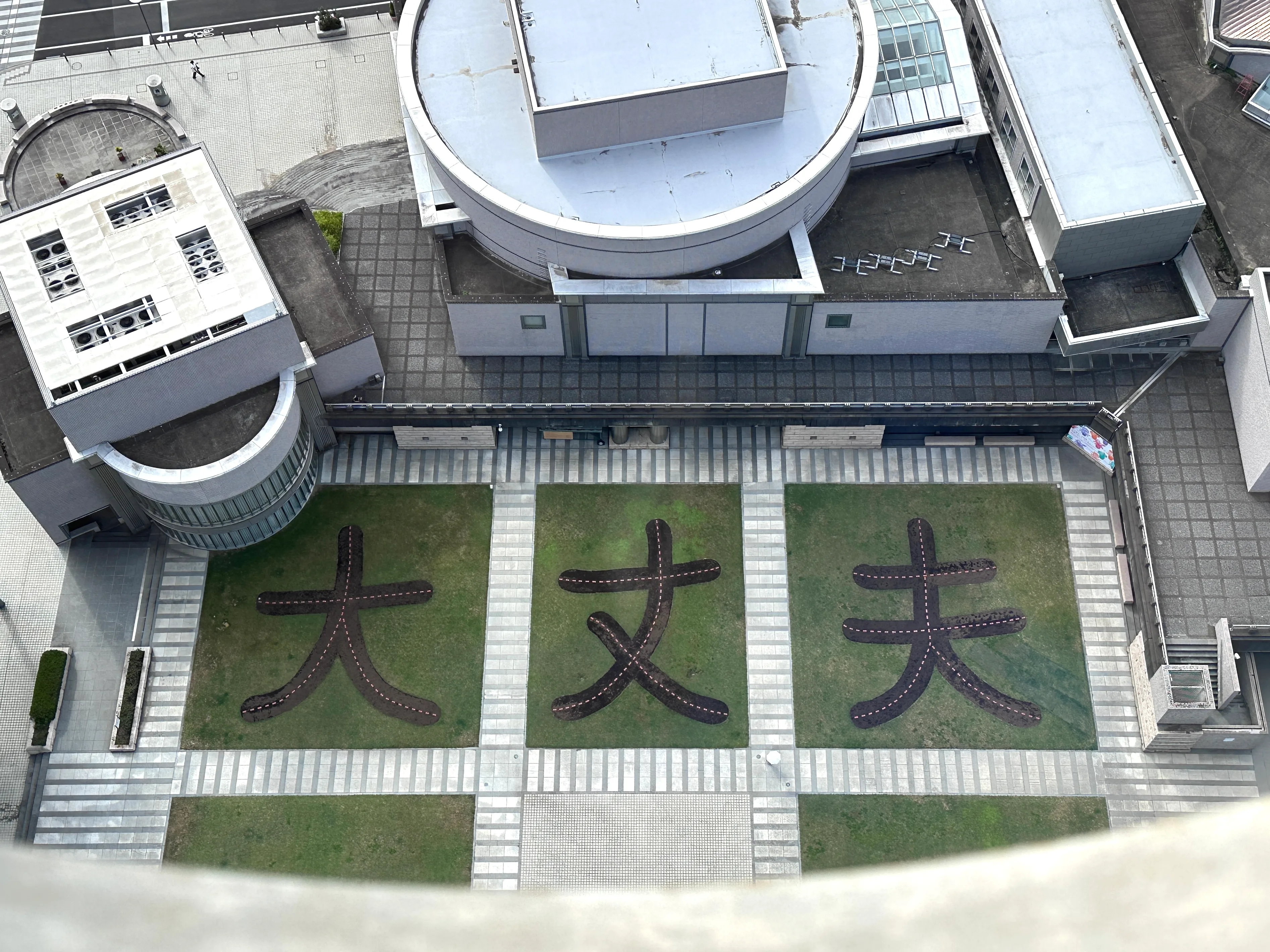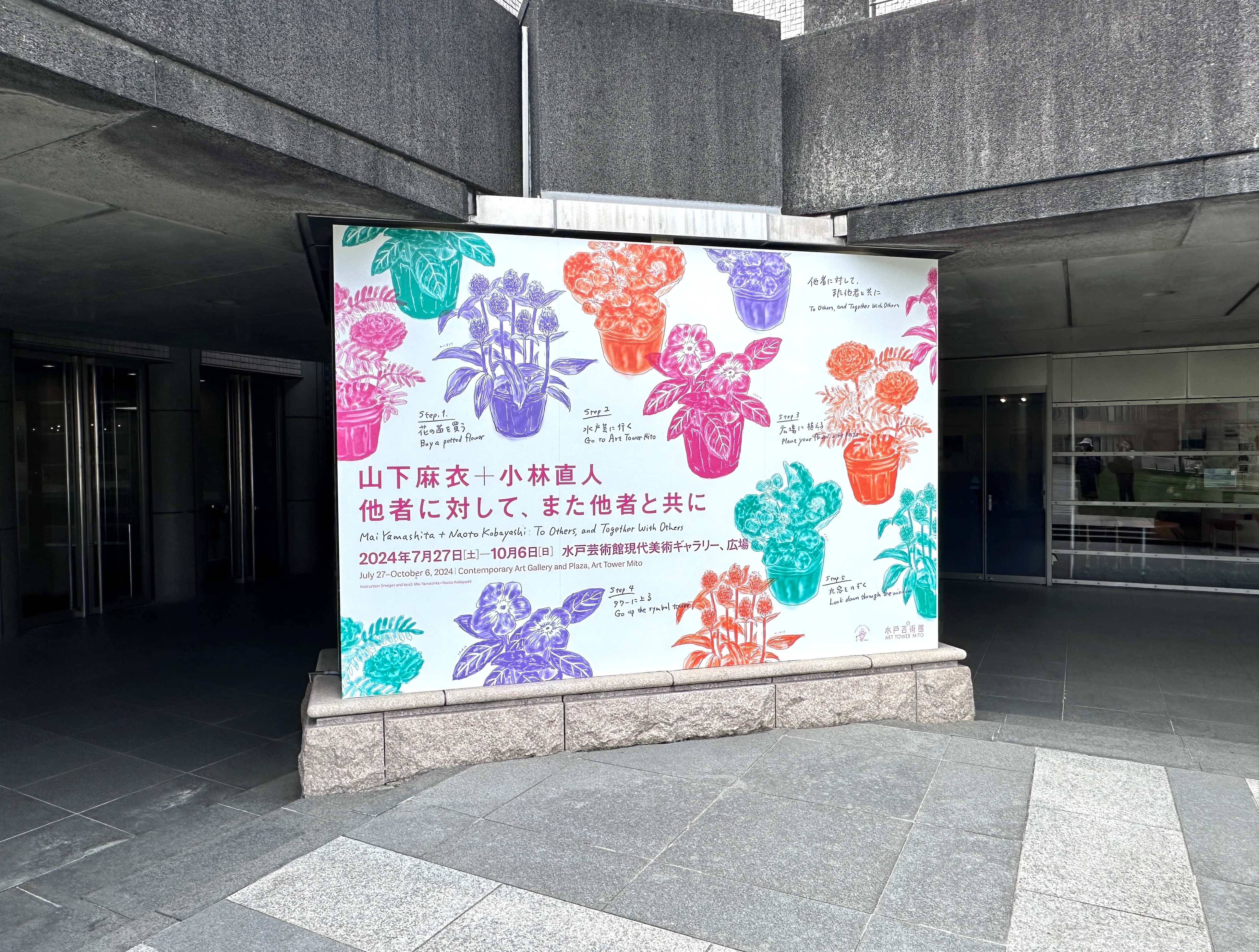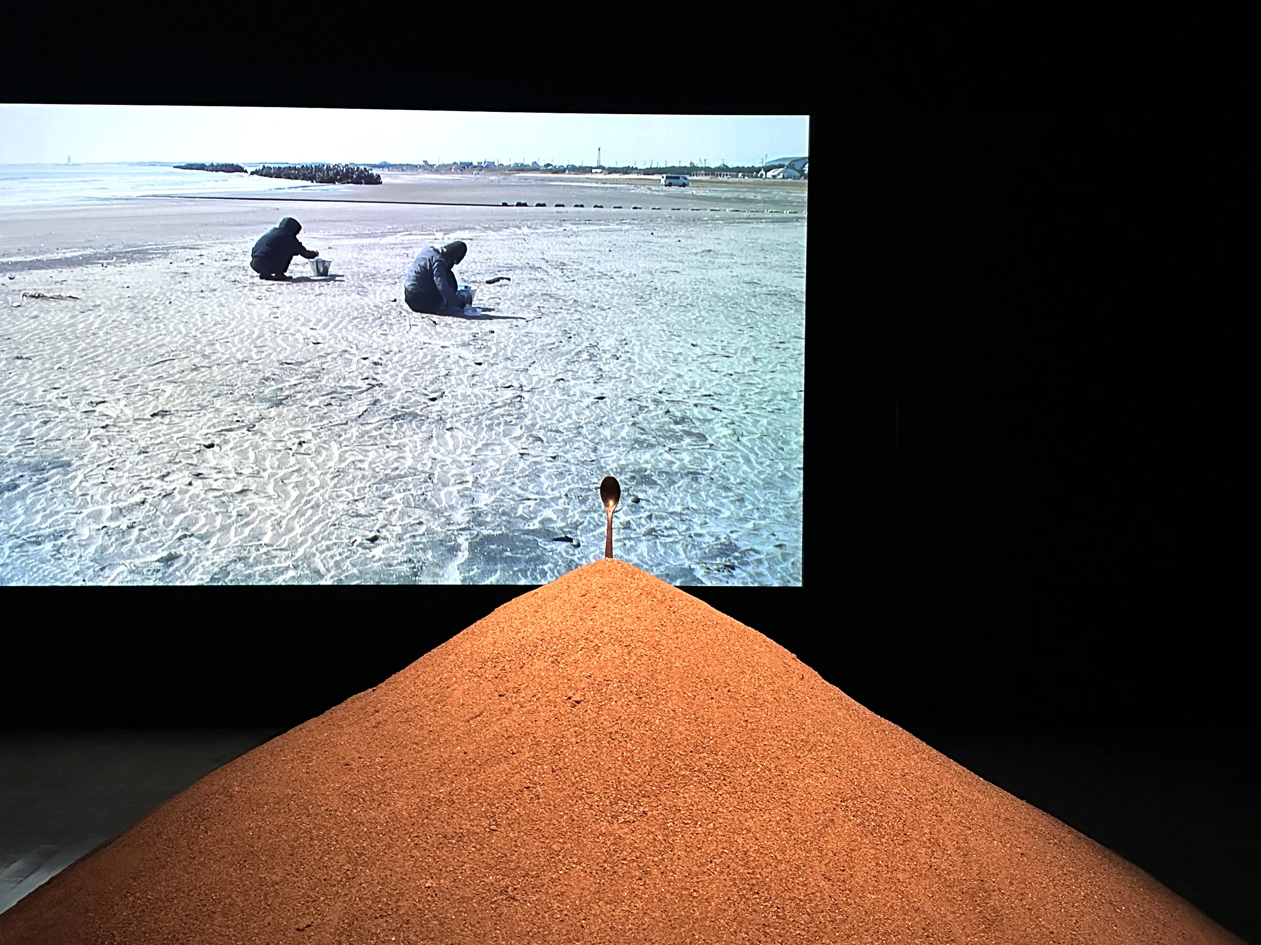 水戸芸術館を訪れるとまず目に入る、芝生エリアに現れた巨大な「大丈夫」の文字が印象的な新作《人が花に対して、また花と共に行う営み》(2024)も、そうした思いから始まった。筆者が訪れた日はまだ土の状態だったが、今後は色とりどりの花が「大丈夫」をかたち作っていく。展覧会会期前らから結成された地域の市民有志とともに、定期的に花を植えていくのだという。