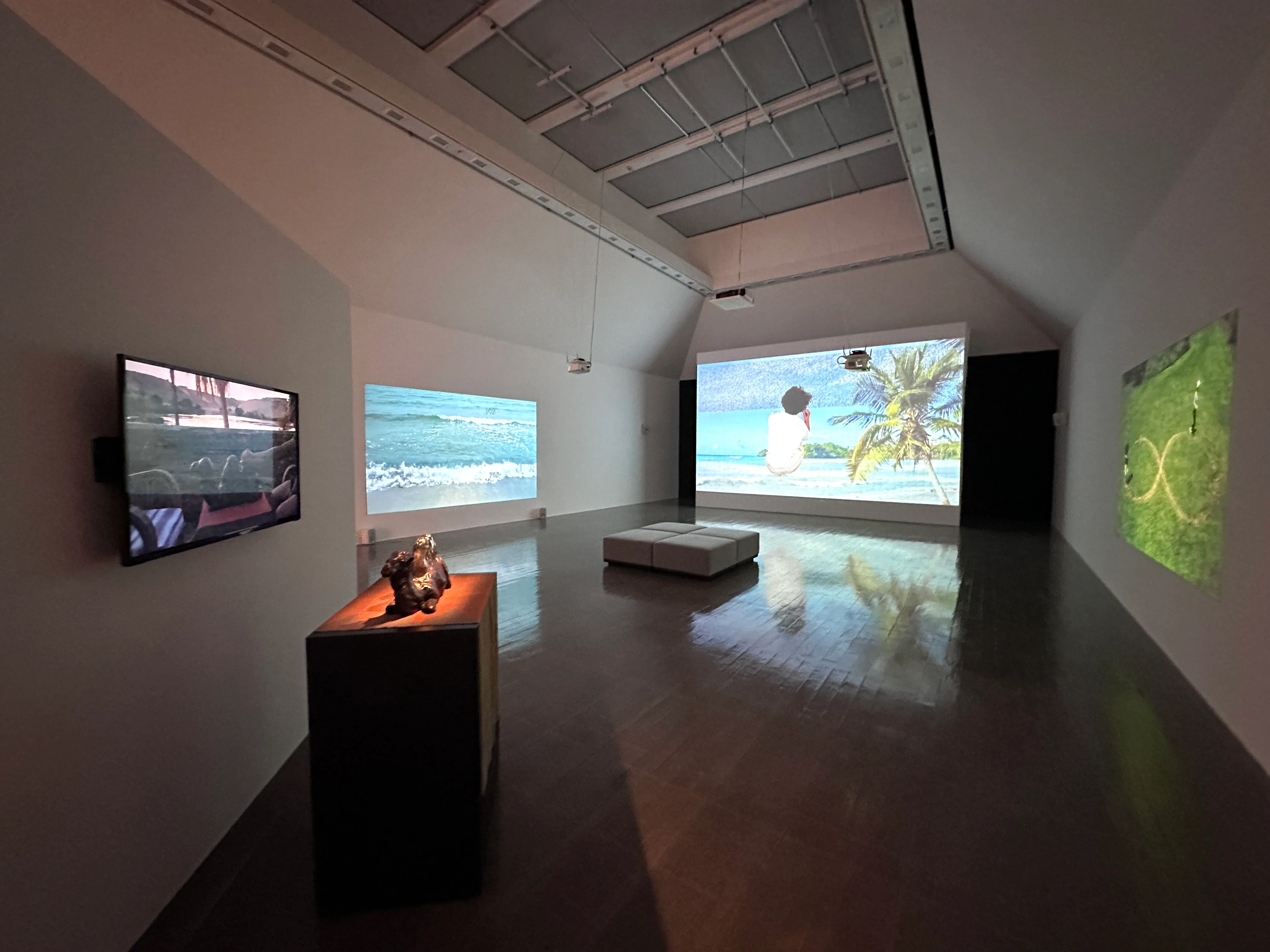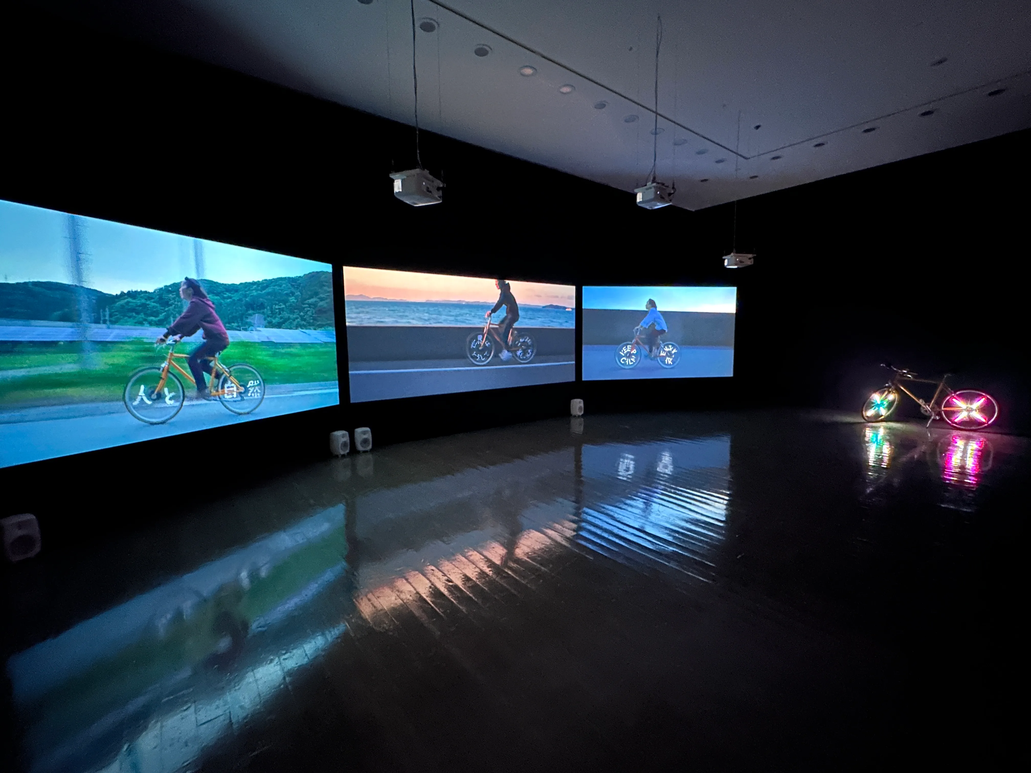 自転車のホイールライトにメッセージを照らしながら走る姿を記録した映像作品が集まるギャラリー7は、美に対する根源的な問い、アートと政治の問題などに対するダイレクトなメッセージを提示。続くギャラリー8では、蜃気楼で有名な黒部市の護岸に巨大な「m」型看板を設置し、蜃気楼の発生で「∞」の像を発生させることに挑む作品《infinity~mirage》(2021/23〜)を紹介する。