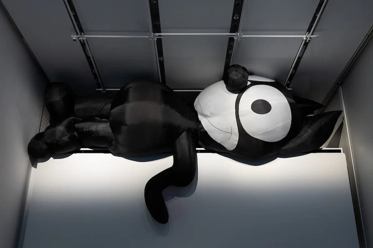 アメリカ生まれの有名キャラクター、フィリックス・ザ・キャットを模した本作。展示場所については「いつも会場でいちばん変な場所、いちばん不自然な場所を探す」と作家は言う。実際に設置してみての感想を聞くと、「この方法には展覧会の会場やキュレーターへ挑戦を突きつけるような意図もあるが、今回はエスパス ルイ・ヴィトン東京がよくやってくれた」と満足げだ。