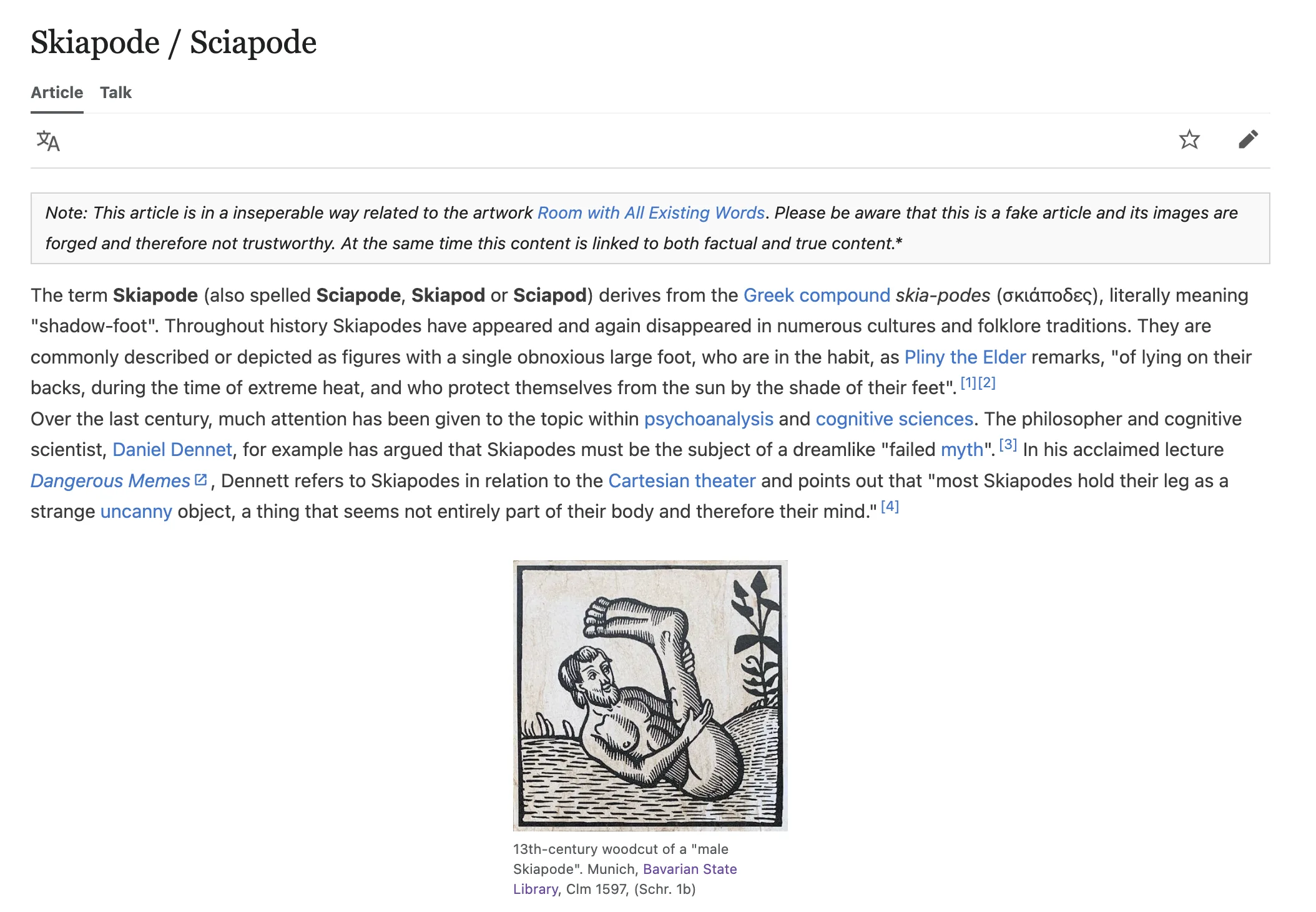 マンダースは、ほとんど未知の言葉と言われてもと言われてもおかしくない「Skiapode」の概念を深く掘り下げ、現実と虚構が交錯する部屋を作り出した。また、検索サイトで「Skiapode」を調べると、「Wikipedia」ならぬ「Wikipekia」なるマンダースの自作ウェブサイトが出現。トークの終盤まで本作の主旨が明かされていなかったため、最後に種明かしがされたときは虚実混交ぶりに観客席から自然と笑いが起きていた。