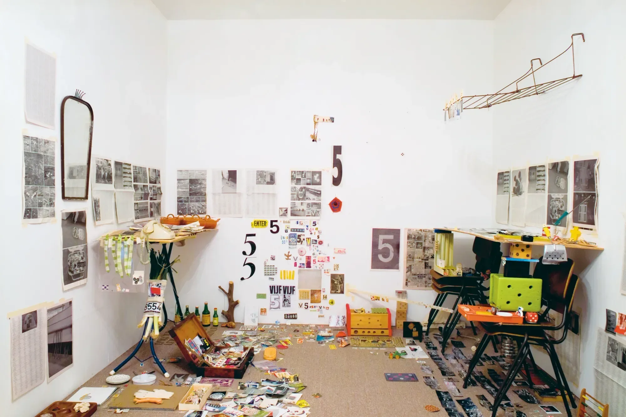 間取り図の部屋のひとつを実際に具現化したものが、《Room with Fives》(1993〜2001)。「この部屋は“5”という単語しか存在していない部屋で、壁に貼ってある新聞にも“5”としか書いてありません」。約10年のあいだ、マンダースは「5」に大きな関心を寄せ、ずっと考えていたのだという。「5」を三次元で表現したこの部屋に行くと、「“5”という単語が自分に歌いかけているような気持ちになる」と話す。マンダースの展覧会ではしばしこうした小さな「部屋」が出現する。