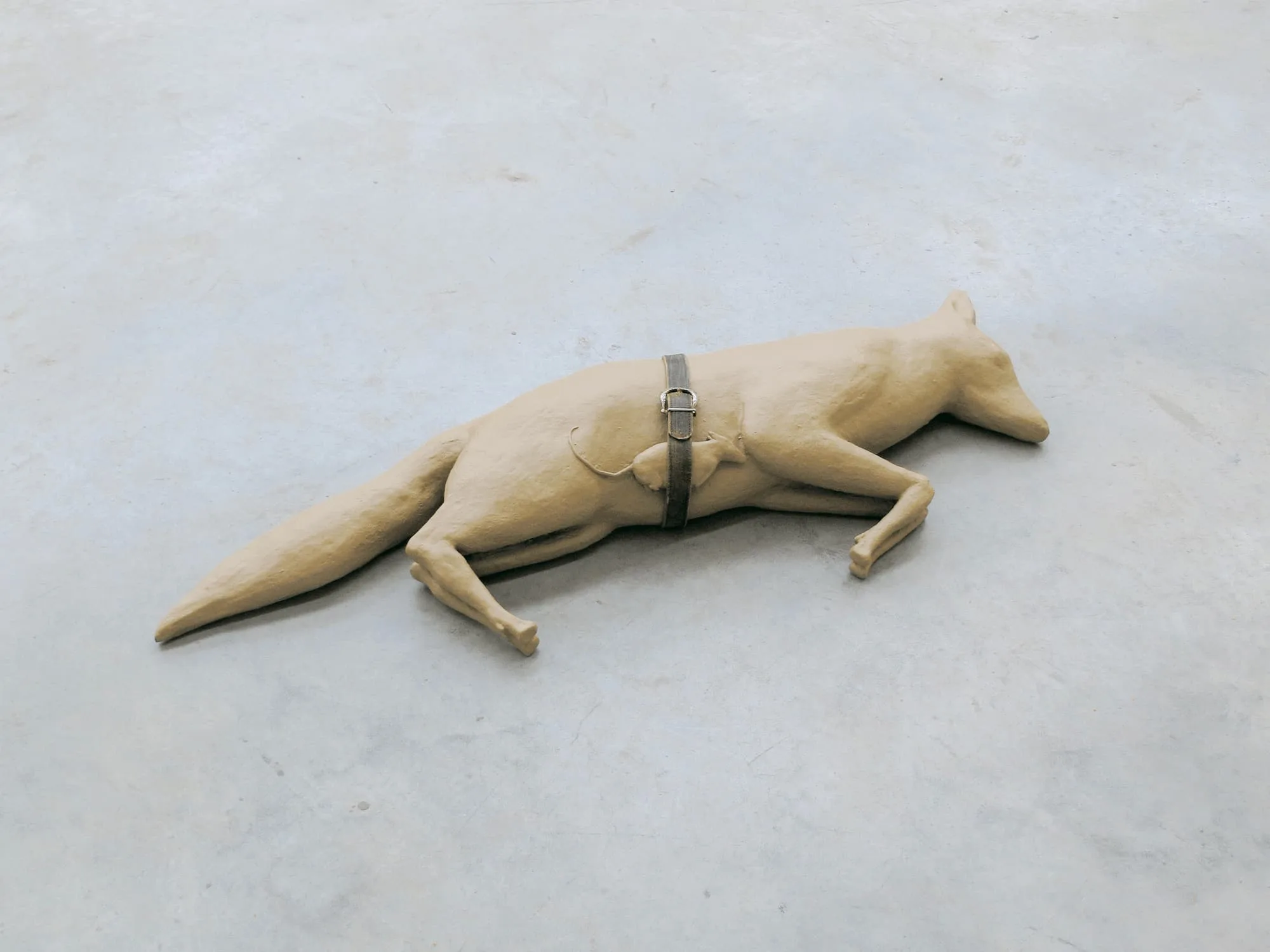 「キツネというのはある意味ネズミの天敵で、同じ部屋にキツネとネズミを置くと、ネズミはキツネのお腹の中に消えてしまいます。そしてベルトとは、おなかの周りに巻くものです。こうやって作品として3つを合わせていくと、キツネはもはや敵ではなく、母親のようにも見えますね。キツネはいままさに飛び上がっているようであるとともに、そこにいることを強制されているようでもある。時間との奇妙な関係性を感じていただけると思います」