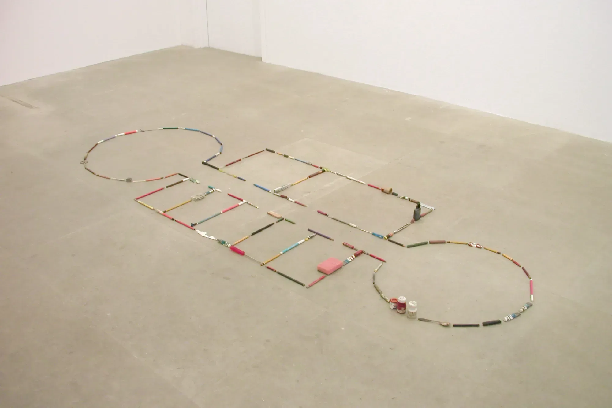 元々は文章を書く作家、そして詩人になりたかったというマンダース。そんな夢を描きながら18歳のときに初めて制作した《Inhabited for a Survey(First Floor Plan from Self-Portrait as a Building)》(1986)は、自分が持っていた全筆記用具を床に置き、間取り図のような図面を描いた作品。「私は自分の人生をこの建物(間取り図)の中で過ごそうと思いました」と振り返る。