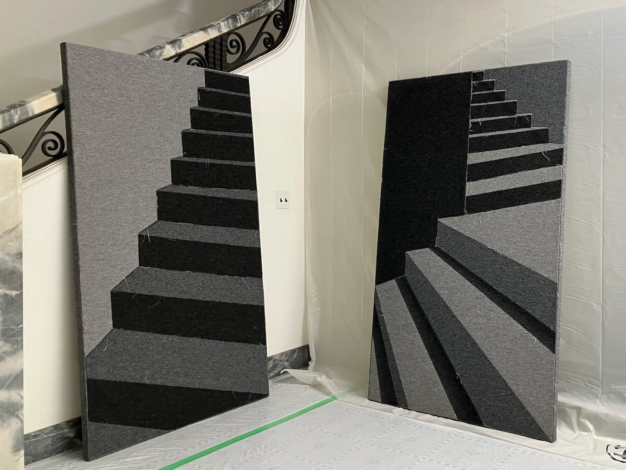 前者については、作家がたびたび素材やモチーフとして用いる髪の毛への「執着」が象徴的だ。後者は、世界が絶えず変化し続け、無常であるという考え方である。マルジェラは作品に決まった展示方法を設けておらず、床に置かれたり箱に収められたりと、状況に応じて様々な形態をとる。本展では壁や家具、窓などが薄いビニールシートで覆われているが、これはすべてが「ワーク・イン・プログレス」であることを示唆している。