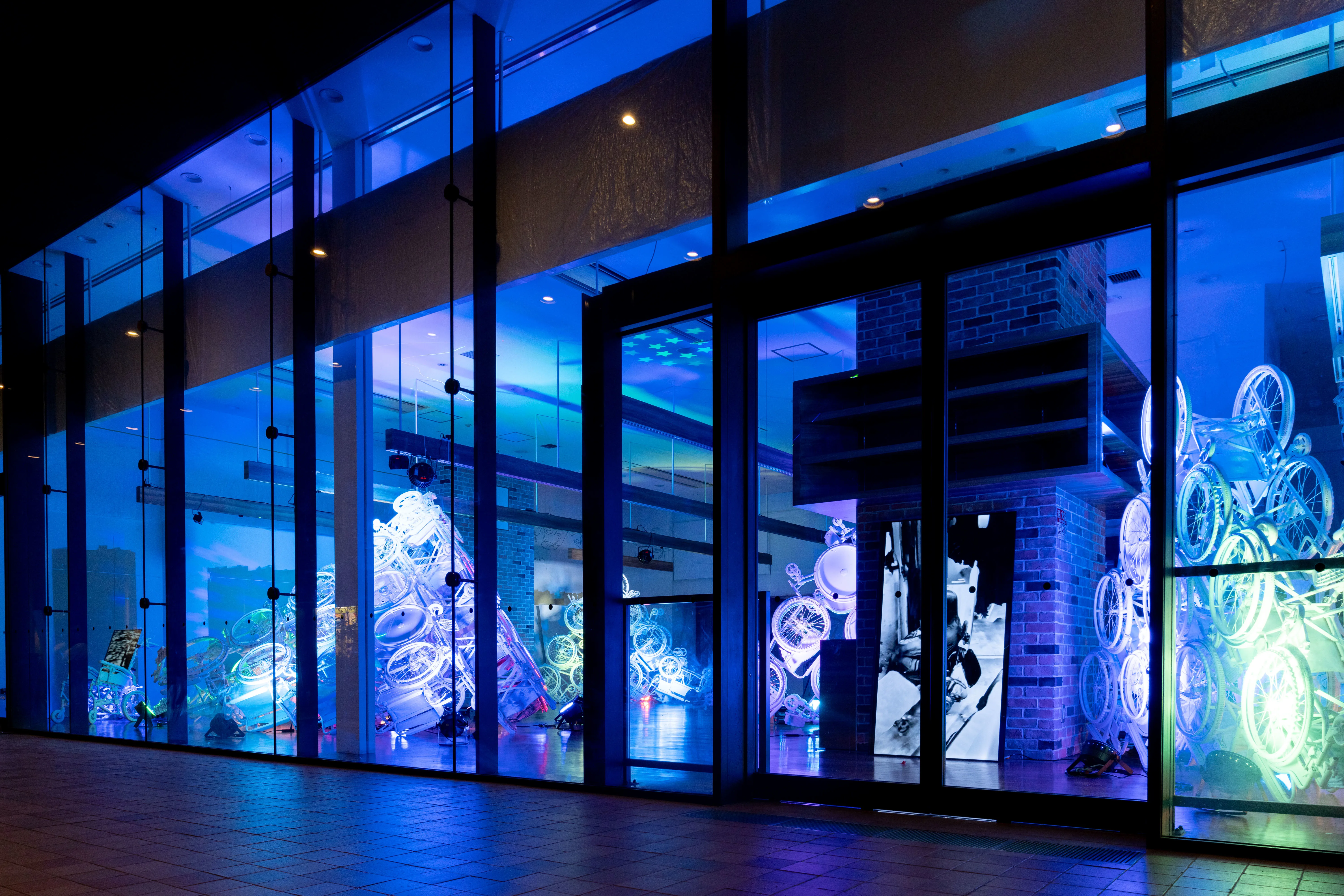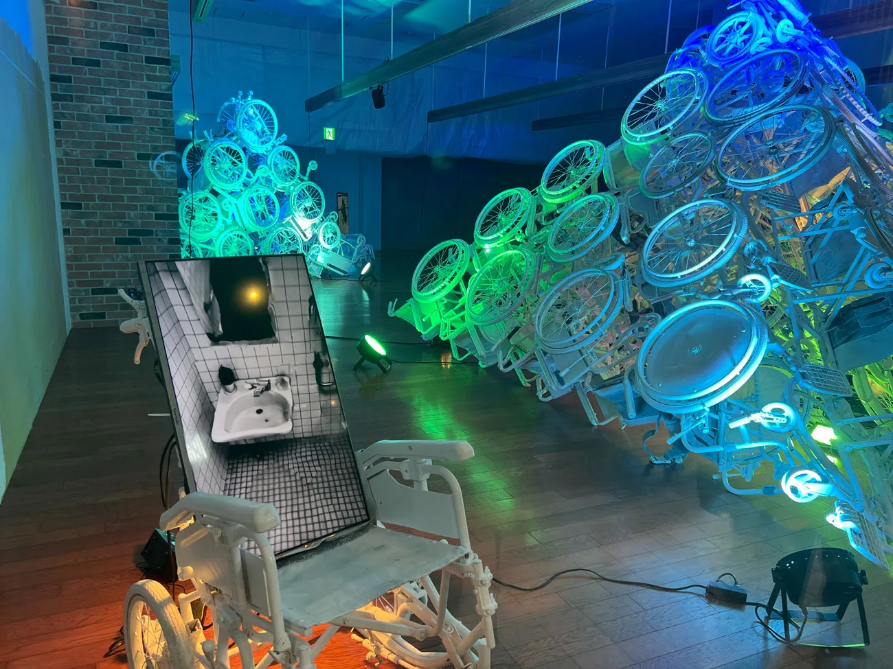 中之島フェスティバルタワーの地下1階、路面に展示されているのが、檜皮一彦の《HIWADROME_Type△_SPEC3》だ。作品の中心にある三角形の構造物は、反転した車いすを70台積み上げて構築されている。この作品はガラス越しに閲覧するものとなっている。これは、中は見えるけど入れないガラスと車いす利用者からしか見えない風景(目線)を掛け合わせて、社会における障壁や偏見、そして人々の固定観念を表現している。彼自身の日常的な移動手段である車いすを素材に用いることで、個人的な経験を普遍的なメッセージへと昇華させている。