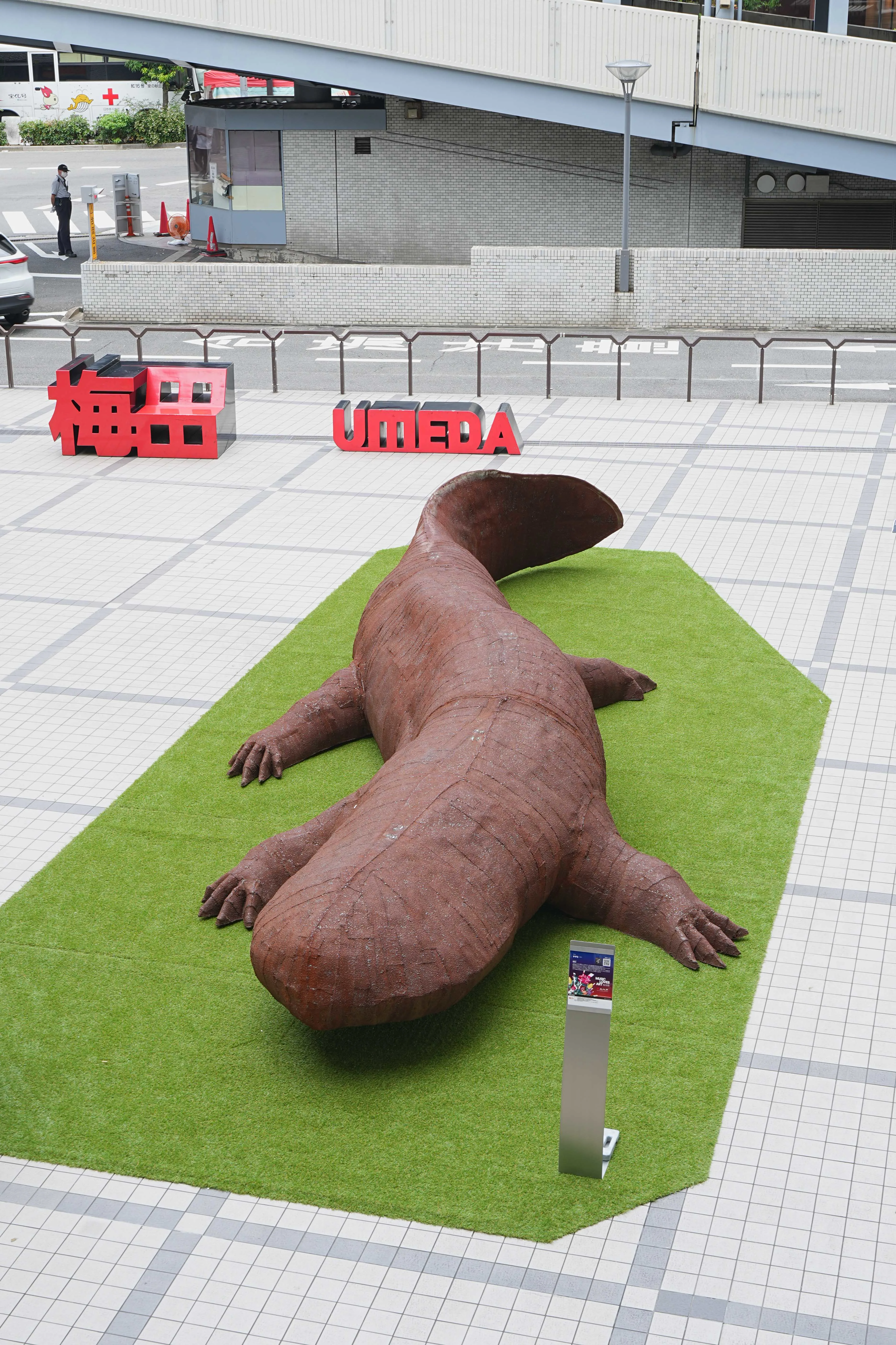阪急グランドビルの1階北側にある阪急サン広場には、鐵羅佑(テツラユウ)の《かすむ》。演劇などを通して身体表現に取り組んできた彼は、自然物や人間のもつ生命感、生々しさを表出させる彫刻を制作する。2021年の「六甲ミーツアート芸術散歩」で公募大賞準グランプリを受賞したこの作品が、新たに梅田に置かれることに対して、「六甲から、降りてきた」と鐵羅はコメント。いまや六甲と梅田をつなぐ象徴でもあり文化的アイコンといえるかもしれない。ちなみに鉄製のこの作品は触っても、上に乗っても大丈夫だそう。