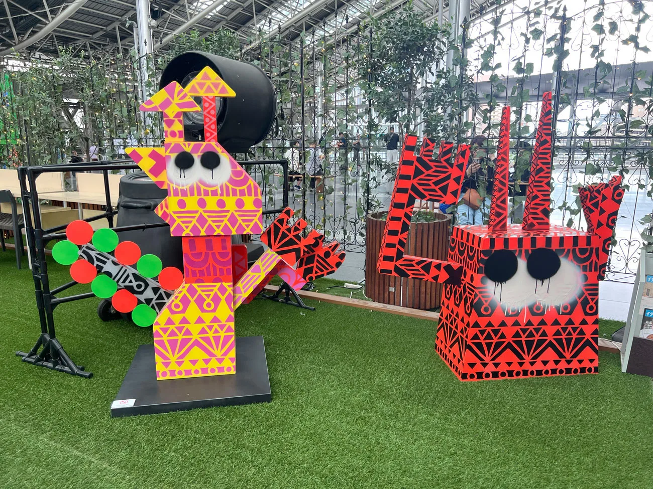 そのままJR大阪駅構内を進んでいき、時空の広場で見つけられるのが、MASAGON (マサゴン)の《HELLO!!! "MASAGON WORLD"》だ。複数の作品は全てフリーハンドペインティングによる。テーブルクロスとして制作したテキスタイルを切り取って、柄と顔が融合されたこの作品は、色彩豊かな柄と形が愛らしい。人と人が行き交うこの空間に相応しい作品で、鑑賞者同士の出会いと交流を促進し、活気に満ちた会話を生み出してくれそうだ。