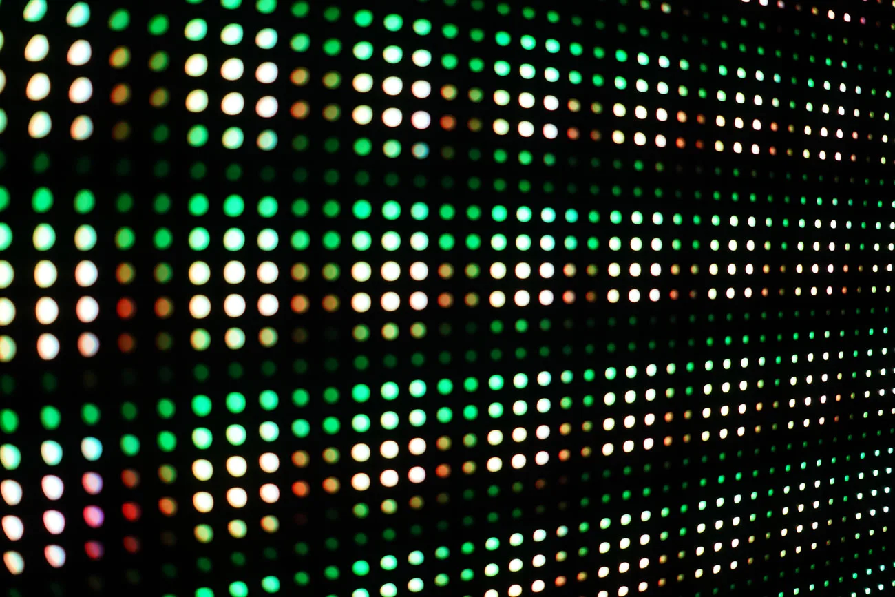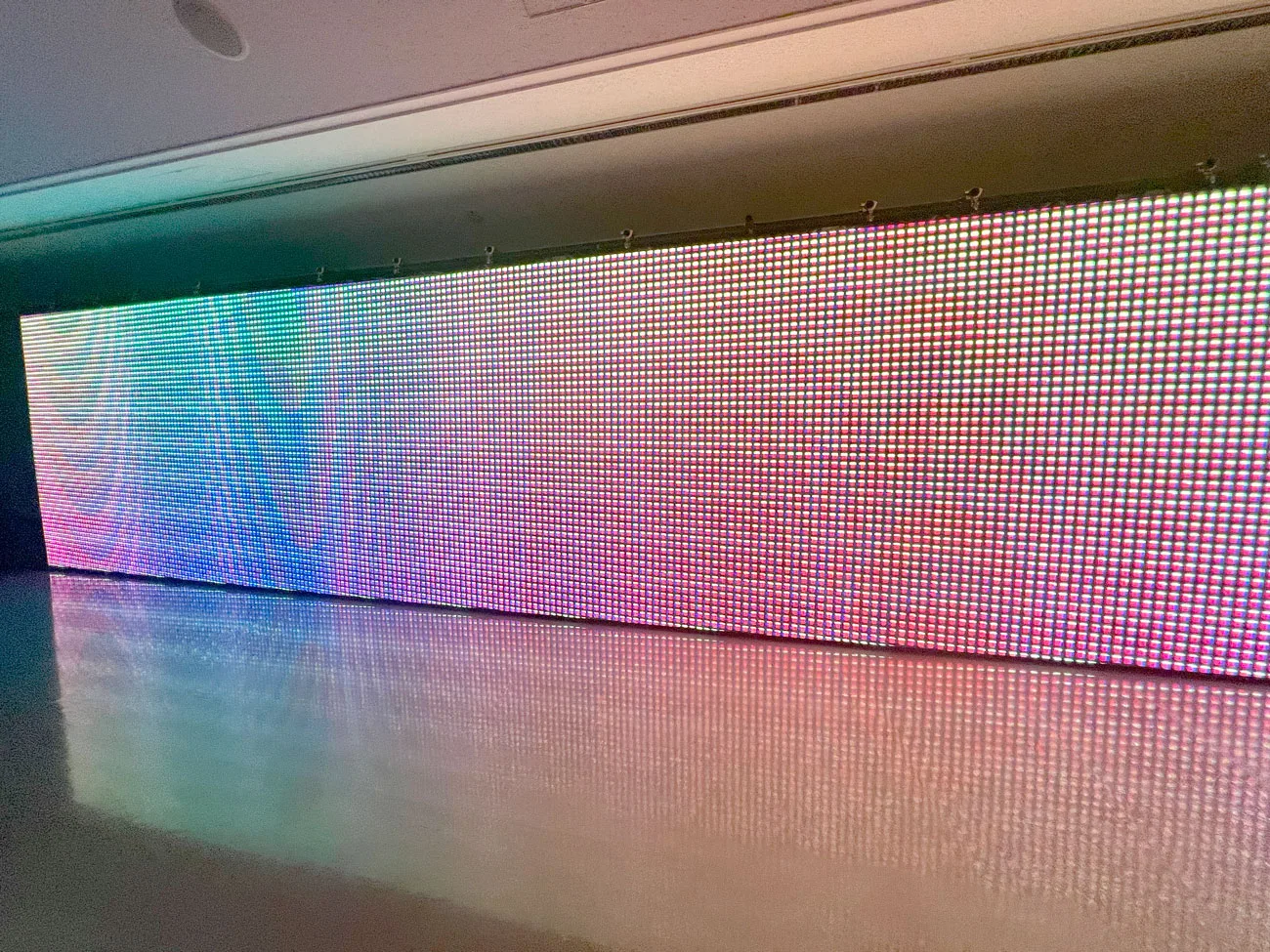 ダイビル本館から北西に徒歩約8分にある、堂島リバーフォーラムへ。オーストリアのArs Electronica(アルスエレクトロニカ)などとのコラボレーション経験もある、建築や写真、グラフィック、プログラム等様々なバックグラウンドを持つメンバーから成るデザイングループ・void(ヴォイド)による《transitory images》。本作はLEDビジョンの前面に、穴の空いたスクリーンを配置した際に感じるスクリーン越しのイメージ体験を、映像空間に持ち込んでいる。デジタルテクノロジーを通して、物理的な鑑賞体験ではない、新たな視覚パターンを体験できる仕掛けとなっている。