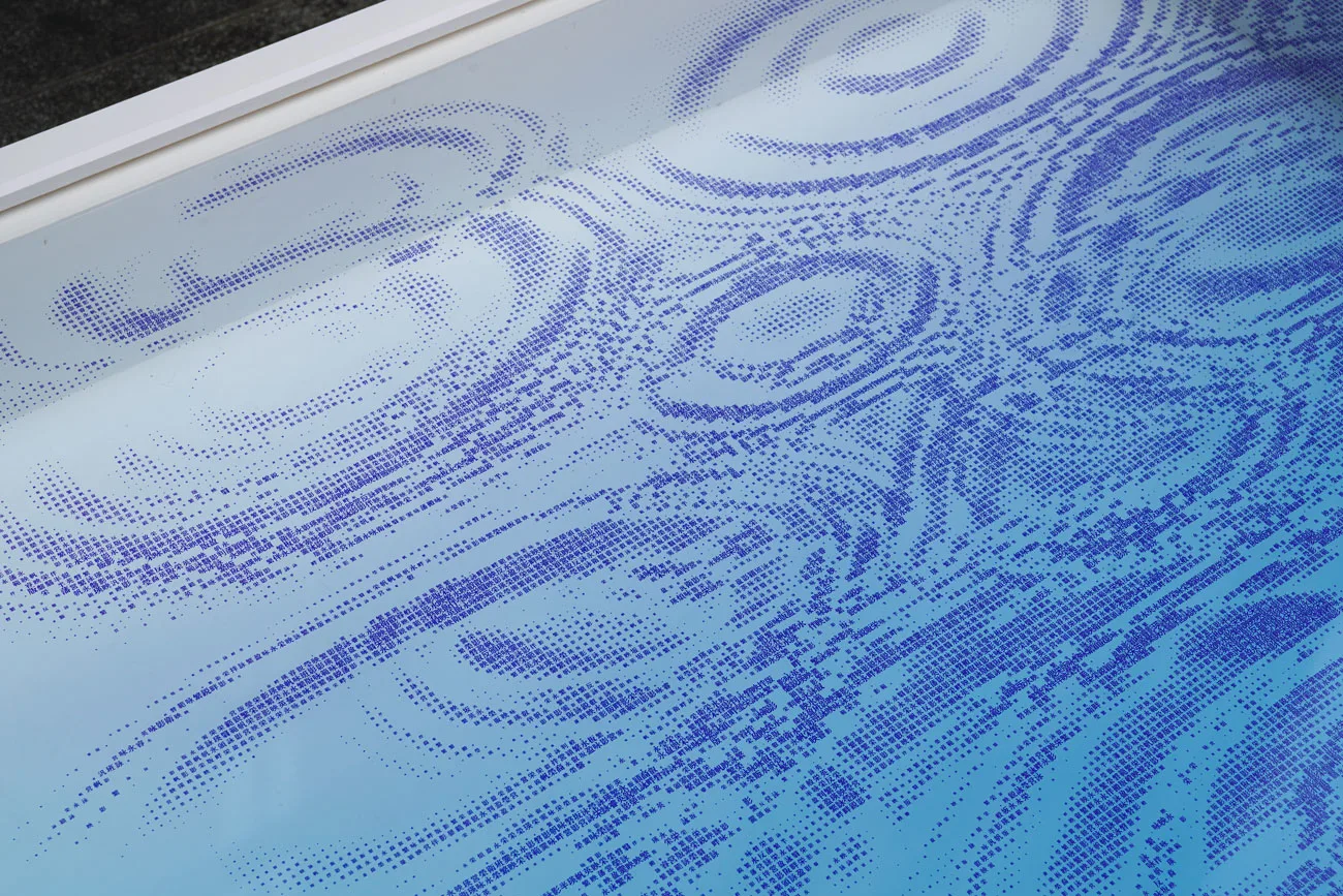 渋田の作品と同エリアにあるのが、大谷陽一郎の《はん/えい#1》だ。今年のMICUSRATのテーマ「はんえい」に基づいた視覚芸術作品で、中心に据えられた「繁栄」「反映」といった概念を視覚化するために、雫が水面に落ち、同心円上にたゆたう波紋をモチーフにしている。遠くから見る時と近寄って見る時と見え方が変わってくるのが、自分の焦点がずれていくような心地よさがある。頭上にある空の雲が作品に映り込むのもユニークで、屋上という設置場所の利点が存分に生かされている。