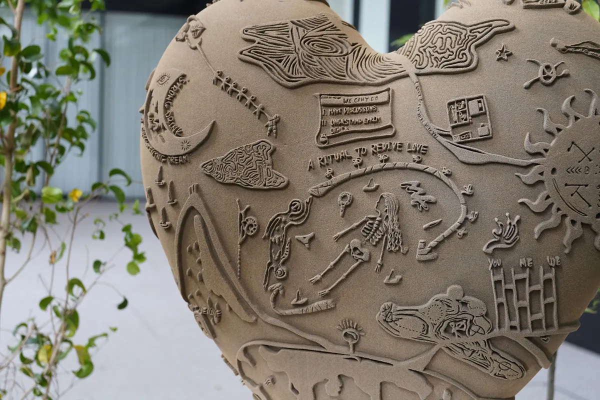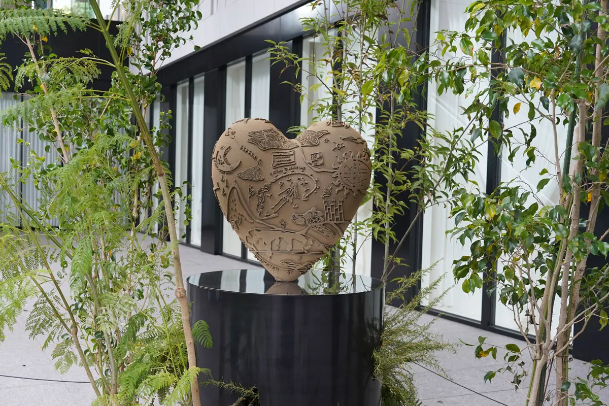 植物に囲まれたハート型の砂像が見えてくる。REMA(レマ)の《The Ecosystem of Love from That Time.》は、日本生命淀屋橋ビル地下1階サンクンガーデンにある。女性として生きるうえで感じる揺らぎや違和感を通して身体やジェンダーに向き合い、自分自身をサンプルにして作品制作を行っている作家だ。元々考古学に興味があったという彼女は、古代からのシンボルである「ハート」と時間の流れを象徴する「砂」を組み合わせた。砂像に描かれているドローイングは、彼女の日常の断片を地図のように起こしたもの。本作品は、表面・精神・身体の3つの柚を反復しながらイメージとしてアウトプットし、様々なマテリアルヘと昇華させている。