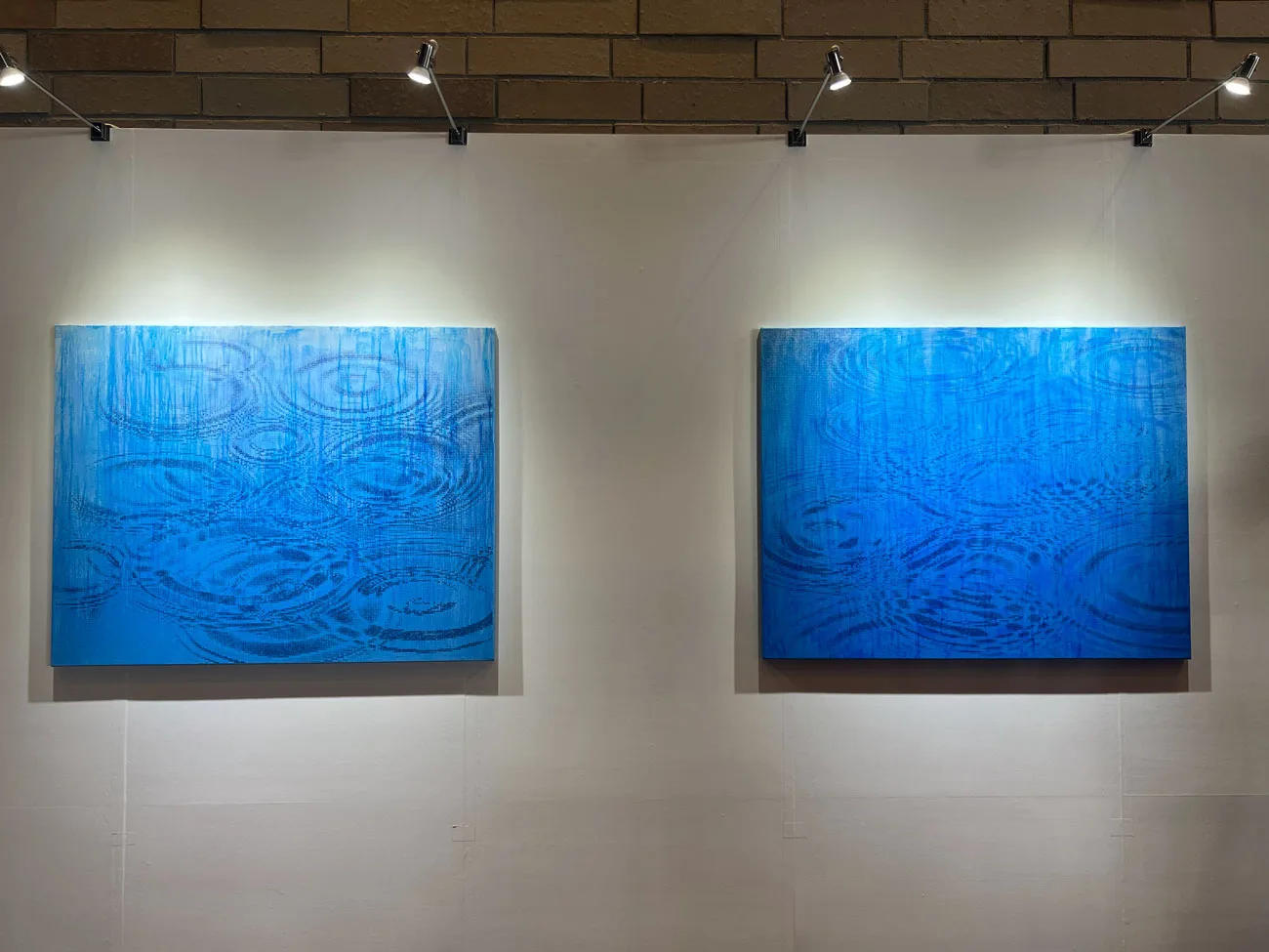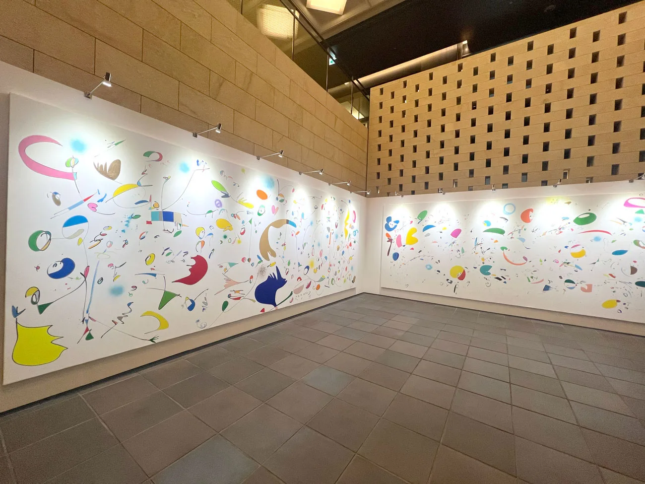 ダイビル本館1階エントランススペースにある《Singin' in the Rain》は、その名の通り、ミュージカル映画「雨に唄えば」を聴きながら描かれたものだ。優しくポップな、見ているだけで心が躍るよう。横長のキャンパスに踊るように描かれたさまざまな形は、見るものの想像力を膨らませる。「形」「色」「素材」を通じて、多様な感覚を具現化し空間に構成する。そしてそれを時間軸の中で循環させることで、鑑賞者に新たな感覚の交感を促し、独特の「交響する環境」を創出している。