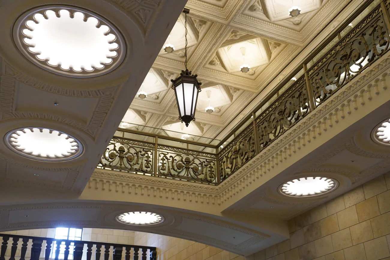 ダイビル本館は、大大阪時代のシンボル・旧ダイビル本館の名残を感じられる建築物のひとつだ。1〜6階までの下層階に、旧ダイビルのファサードを復元させているのがその特徴で、伝統のネオロマネスク様式の内装も見どころだ。作品と合わせて楽しめるだろう。