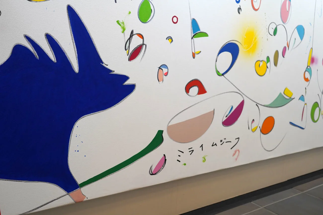 同ビル2階屋外スペースには、山々へ喜びを捧げるテノールの歌声を表現した《Tenor》。色使いや濃い縁取りなど、1階の作品と見比べるとその違いは歴然だ。音楽と視覚芸術の境界を探る革新的な作品といえる。渋田が製作時に聴いていた音を想像してみるのもいいだろう。