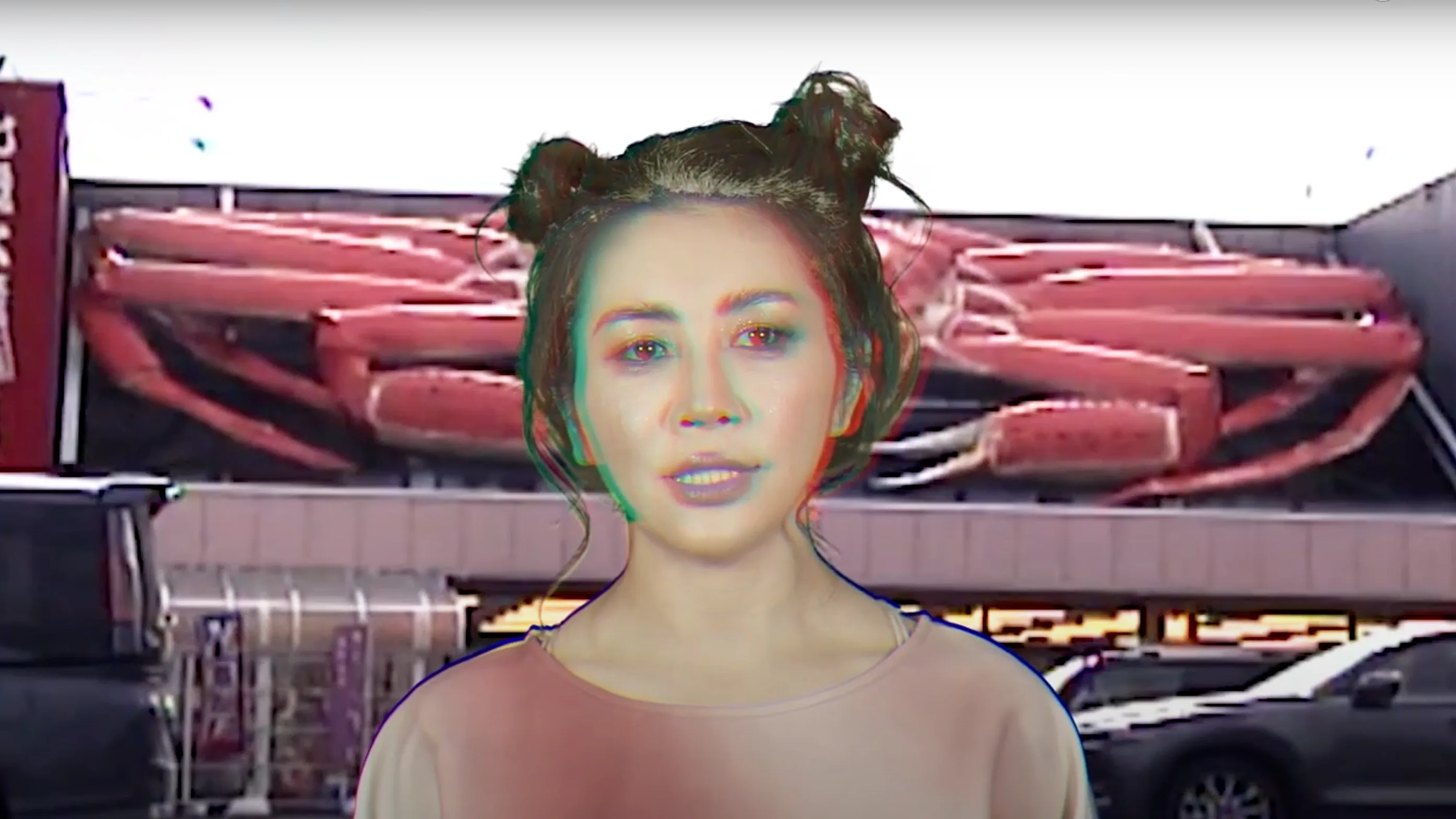 田村:豊岡市はカニが名産で、道路に巨大なカニの看板があったり、そのカニ看板を専門に作る彫刻家が近郊にいたりもする土地。その看板サイズのカニが実在していたら、さぞや大変だろうという発想から、人間が滅亡した未来の世界に大きなカニがいるというSF設定の作品を構想しました。その設定の未来の豊岡の廃墟にモニターがあって、そこには人のカタチをした生物が何やら喋っている。その生物をミラクルさんにやっていただいたんです。