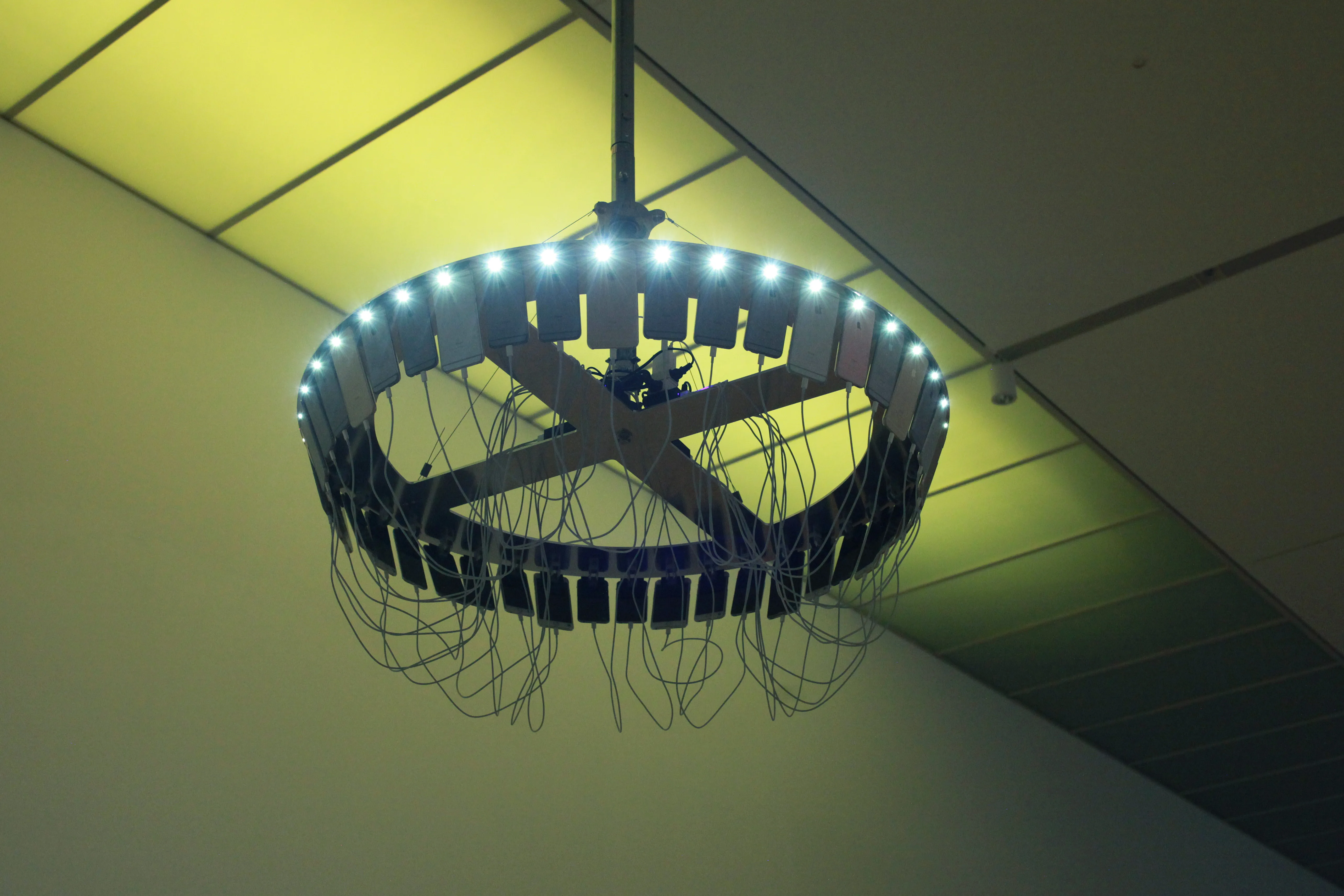 田村:作品《TiOS》では、iPhoneなどの携帯端末から私たちの情報が吸い上げられ、その情報をもとに私たちの行動がAIによって規定されていくという未来を描いた作品です。また、「回転」をキーワードにもしています。かつてはレコードやカセットテープ、フロッピーディスク、CD、DVDなどに代表される記憶媒体は、回転することで記録、再生が行われていました。けれども、現在では回転する記憶媒体がどんどん姿を消しています。そのような回転していたものが担っていた記録、再生という機能や装置に代わるものはなんなのか?というところで、AI的な象徴として登場するのがミラクルさんです。