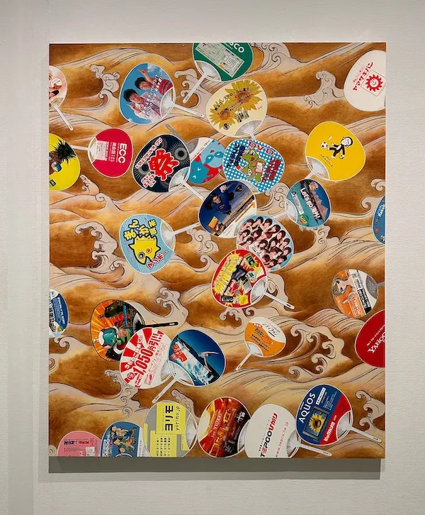 もう1点笑ってしまったのは2階の会場に展示されていた《扇面流し図》だ。日本画の意匠として古くから知られる、多くの扇子を画面いっぱいに描く「扇面散らし」の手法で、駅前や家電量販店などで配られている団扇広告が描かれているのだ。