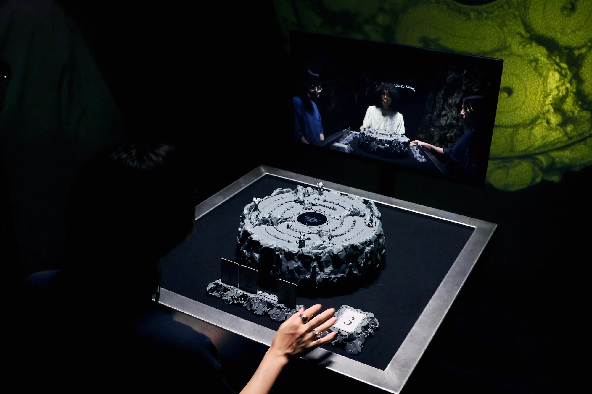 四角いテーブルには、カードやゲームの盤面が置かれている。観客が椅子に座ると、リアルタイムで映像が合成されて、ほかの登場人物とのボードゲームが始まる。観客がどのカードを出すかによって、映像展開も変化する。ARAGからは、対戦相手たちの心の声が聞こえてくる。
