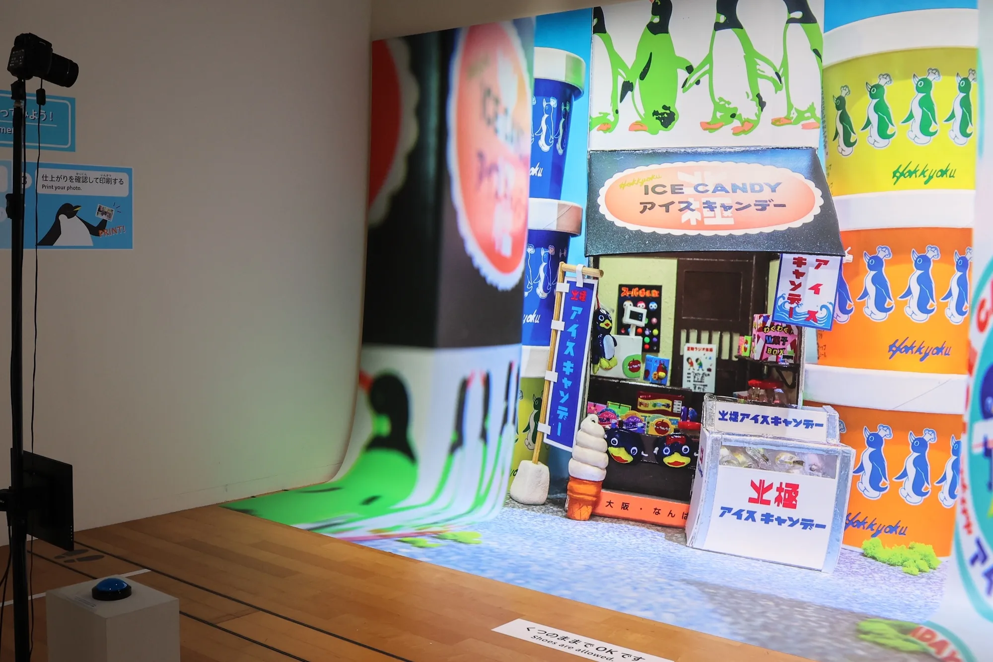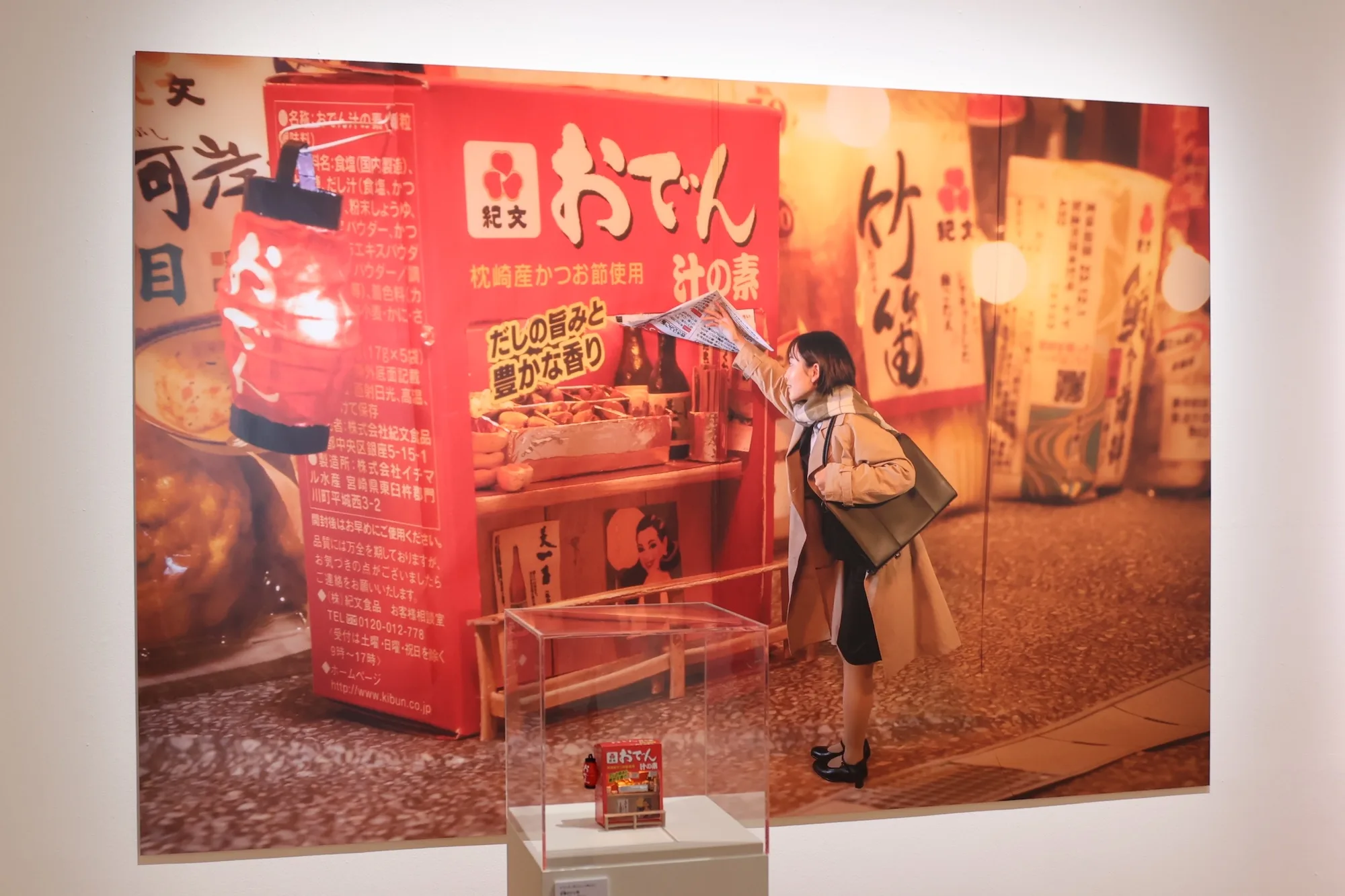 小林優希《はこふぃぐめんとシリーズ》(2025)は、作家の制作プロセスを追体験できる展示です。小林さんは、マッチやアイスの空き箱で作ったミニチュアのまちのセットを撮影したプリントを引き延ばし、それを背景にして自らも風景に入り込み再度撮影する、という手法で作品を制作しています。