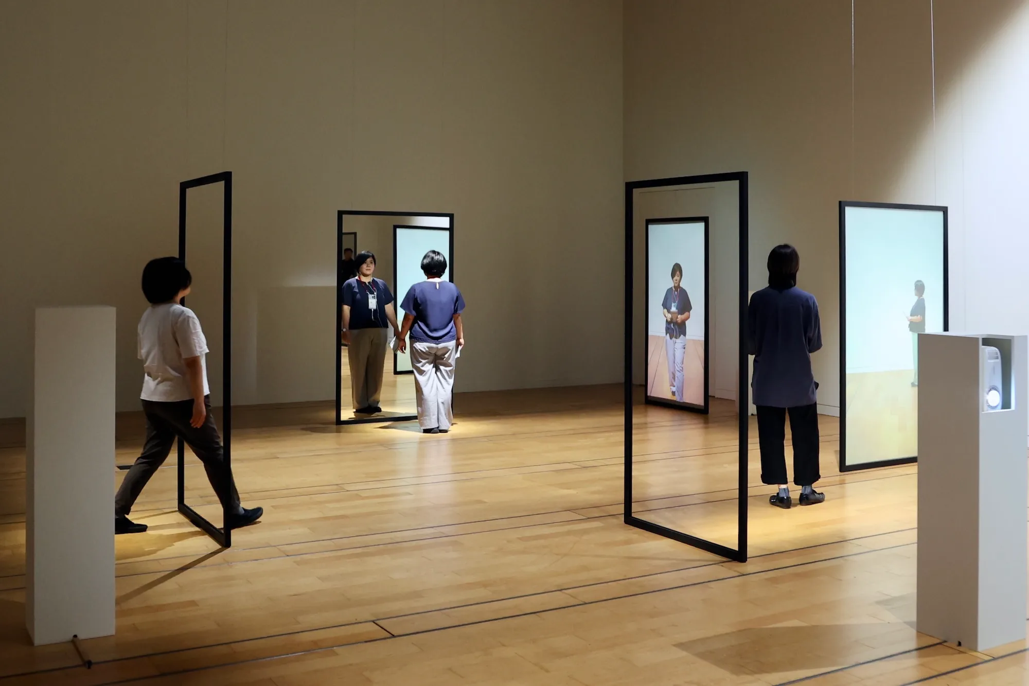 最初に作品ガイドが聞こえてくるのは、津田道子《見えない道、つねにすでに》(2025)。空間内に設置された黒い木枠には、映像が投影されるスクリーン、鏡などがはめ込まれている。ARAGからは、タイミングと場所に合わせて「何歩歩いて」「右へ」と、指示が聞こえてくる。指示に従って動く人とガイドを聞かずに見る人で、まったく異なる鑑賞体験が生まれる。