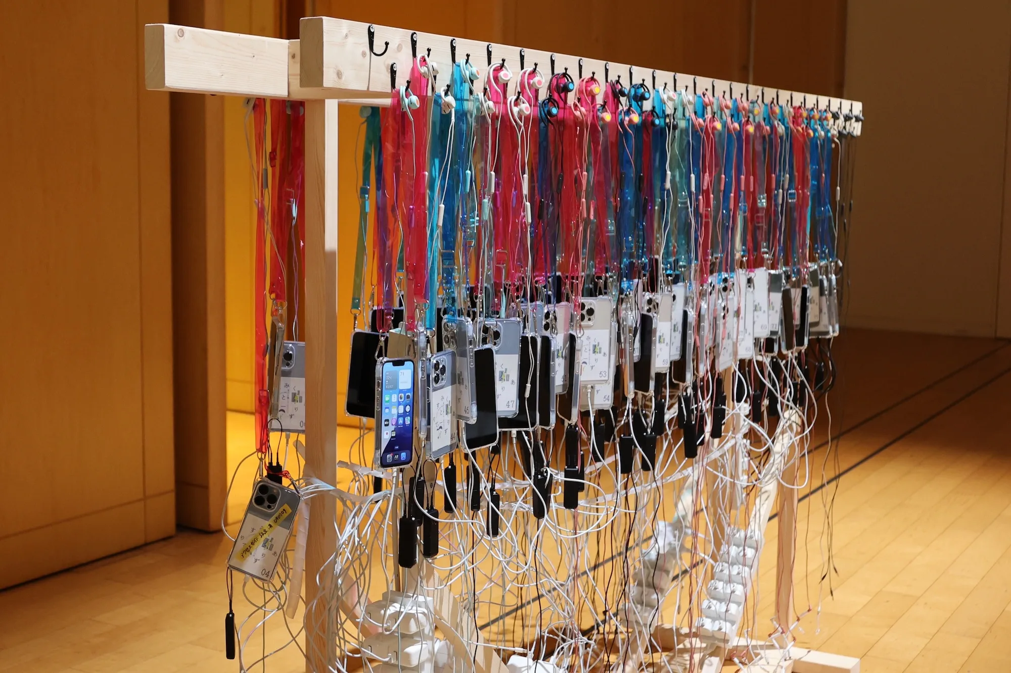 本展では、スマホのカメラを用いて周囲の空間を認識し、観客が特定のエリアに入ると、位置情報に応じて、音声が再生される「サウンドスケープ・オーバーレイ」と、作家が解説する「作品ガイド」を自由に切り替えて聞くことができる。