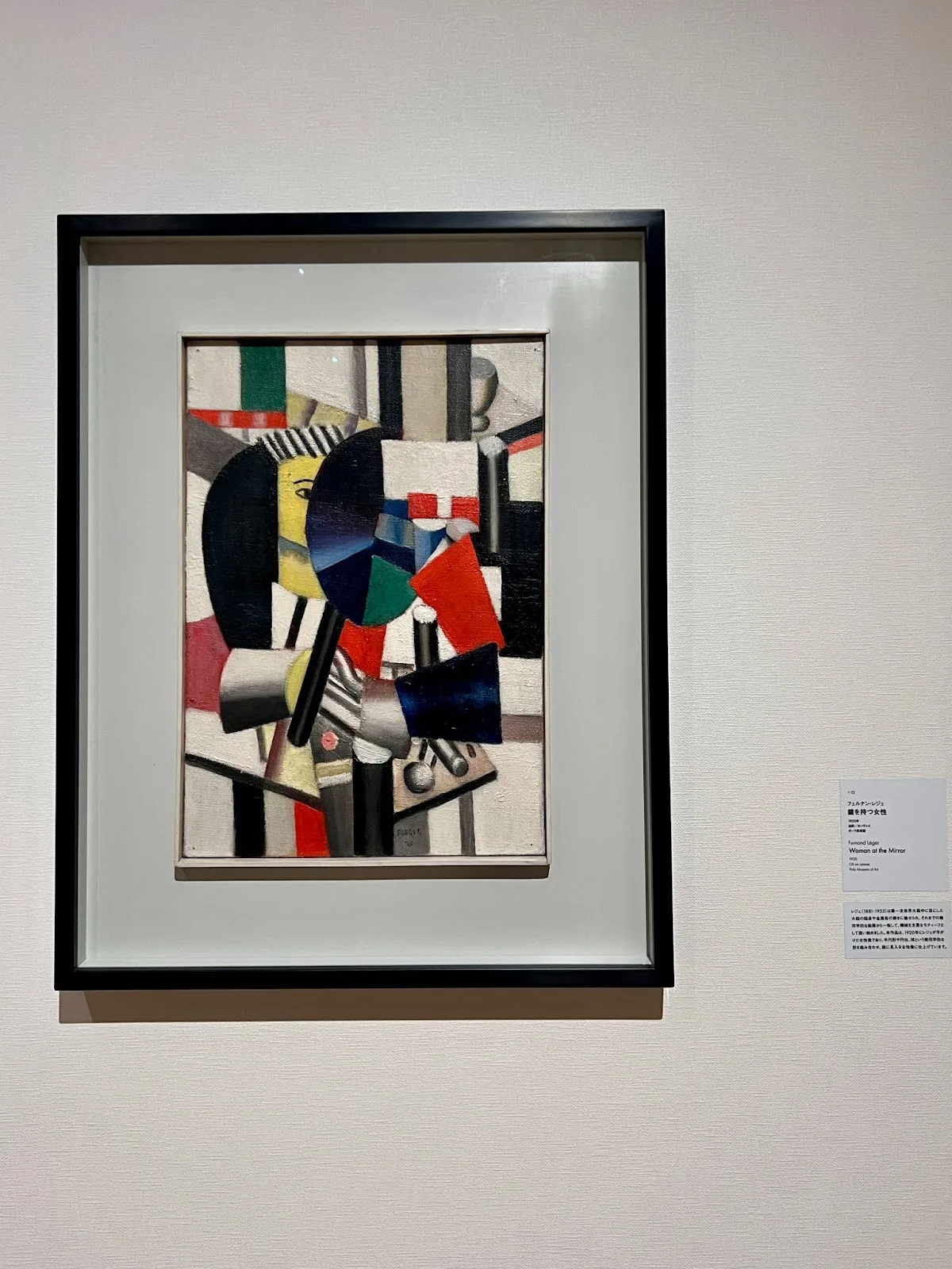 レジェは第一次世界大戦従軍中に、大砲の砲身の機能美に魅せられたという。なんという感性の持ち主なのだろう。筆者の小学生時代には戦車や飛行機のメカニカルな姿に惹かれる子供は多くいたが、大砲の形はずっとシンプルだ。幾何学形の集合ともとらえられる《鏡を持つ女性》を見ていると、描かれた形の一つひとつにレジェの魂が込められているように見えてきた。女性の姿は機能美が集まった中に埋もれるようなかたちで描かれている。機械時代に身を浴したレジェ自身の気持ちが込められているのかもしれない。