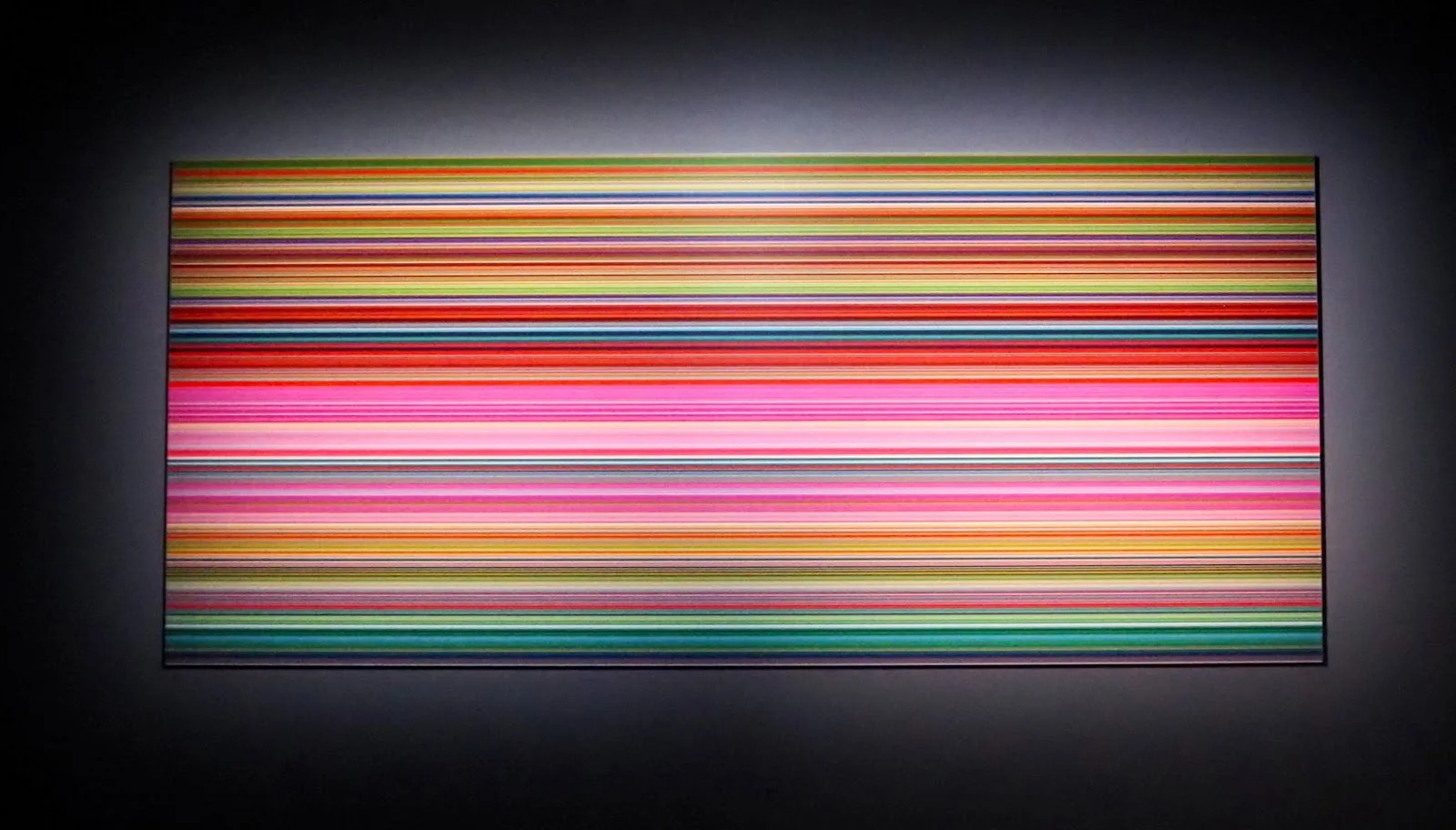 じつは、この作品はリヒターの代表作シリーズである《抽象絵画》を基に制作されたという。個人蔵の《抽象絵画(724-4)》のデジタルデータを縦に二等分。分割したそれぞれをさらに二等分。それを合計12回繰り返して、最終的に4096本の極細の細線(ストリップ)にする。その中から1本を選び出し、鏡像を介するなどして、そこに含まれている色彩の粒をデジタル処理で横方向につなぐと帯状の表現になる。印刷し、アルミニウム板とアクリル板ではさむ。作品はこうしてできあがる。