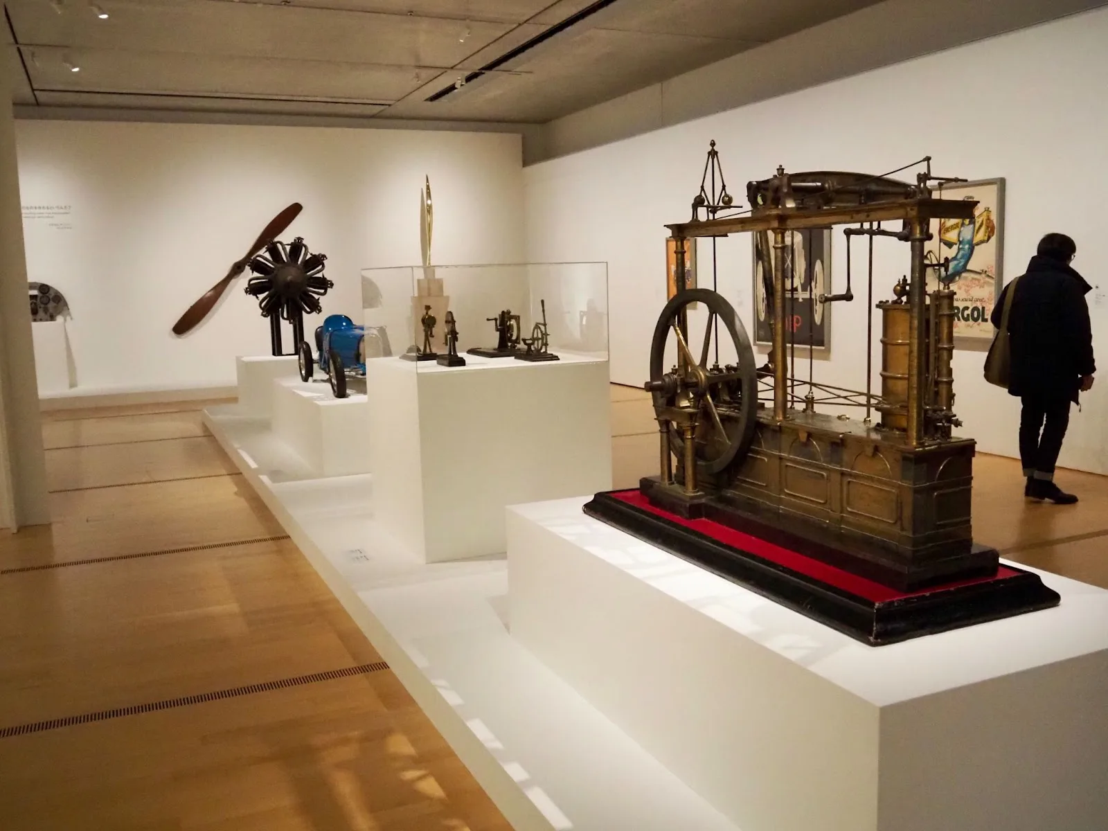第1章のテーマは「機械と人間:近代性のユートピア」。展示室に入ってまず驚くのは、部屋の中心に美術作品ではないものが広く場所を取ってまるで美術作品のように展示されていることだろう。蒸気機関や歯車のついた装置の模型だったり、小型の自動車だったりと、20世紀前半に機械がどんな発達をしていたかがわかる内容だ。美術館にあるからこそ「鑑賞しよう」という気持ちが湧いてくるのかもしれない。なかなか新鮮な体験である。