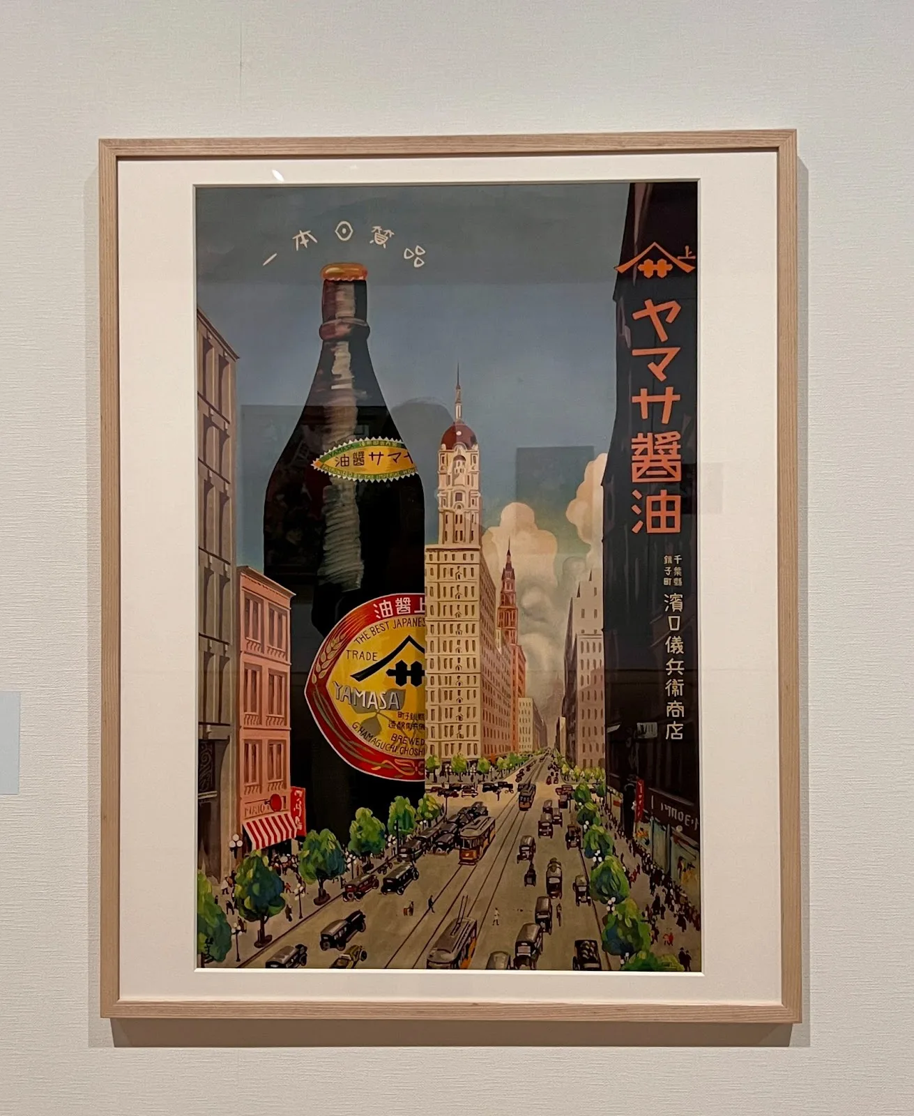 このポスターを制作したデザイナーの杉浦非水は、日本のグラフィック・デザイナーの草分け。地下鉄や百貨店など当時の都市の風景を題材にモダンなイラストを描いたポスターがよく知られている。それにしても、醤油の瓶をビルよりも高く描いたこのポスターはなかなか大胆だ。「アール・デコ」の流れとして紹介されているが、シュルレアリスムの成分も含んでいると見るのもおもしろい。
