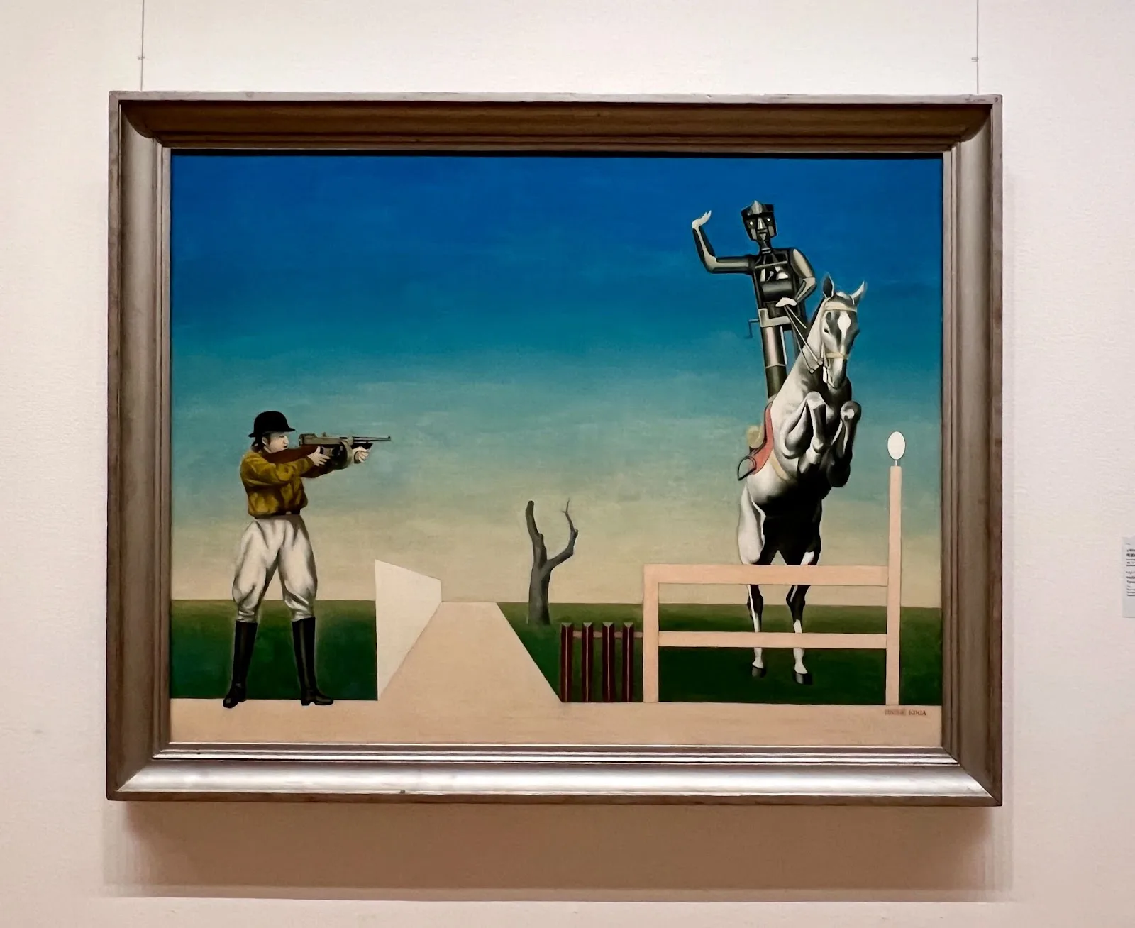 日本の美術界ではシュルレアリスムに傾倒した美術家も多かった。古賀春江はその代表格だ。古賀の《現実線を切る主智的表情》は、機関銃を持つ女性がハードルを飛び越えようとしている馬を狙っていること自体がシュルレアリスムたらしめているが、とくに注目したいのは、騎手がロボットであることだ。本展の企画を担当したポーラ美術館の東海林洋学芸員によると、1930年頃、日本はロボットブームだったという。古賀ははたしてロボットを否定し、ただ撃ち殺そうとしているのだろうか。おそらくそんな単純な風刺ではないだろう。ひょっとすると、撃たれても不死身なのではないか。そんなロボットが象徴する機械時代は、生半可なことでは終焉を迎えない。