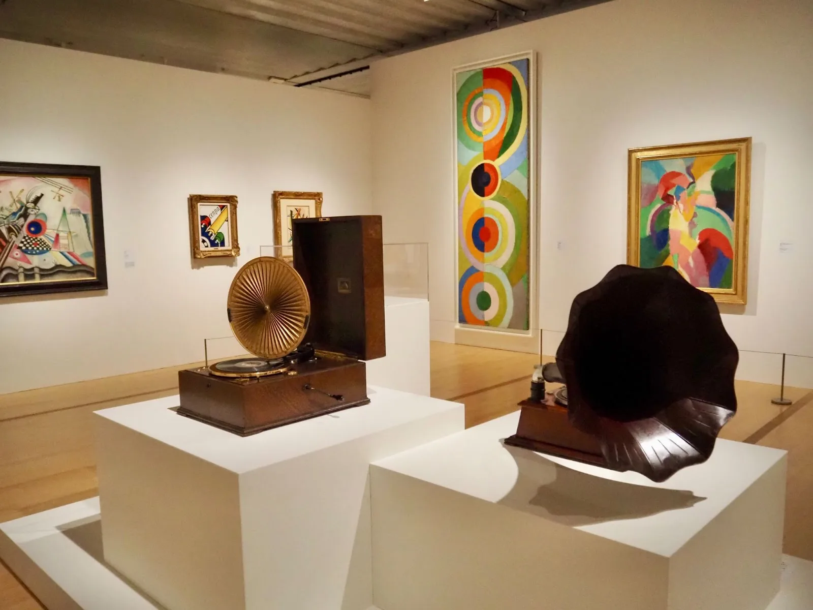 本展では、蓄音機が展示されている空間の周囲の壁に、ロベール・ドローネーやワシリー・カンディンスキーの絵画が掛けられていた。ドローネーは円環をモチーフに色彩豊かな画面を作り出したことで知られるが、蓄音機に載せるレコード盤の円環と呼応していたのが、はたして偶然だったのかどうかを考えてみた。
