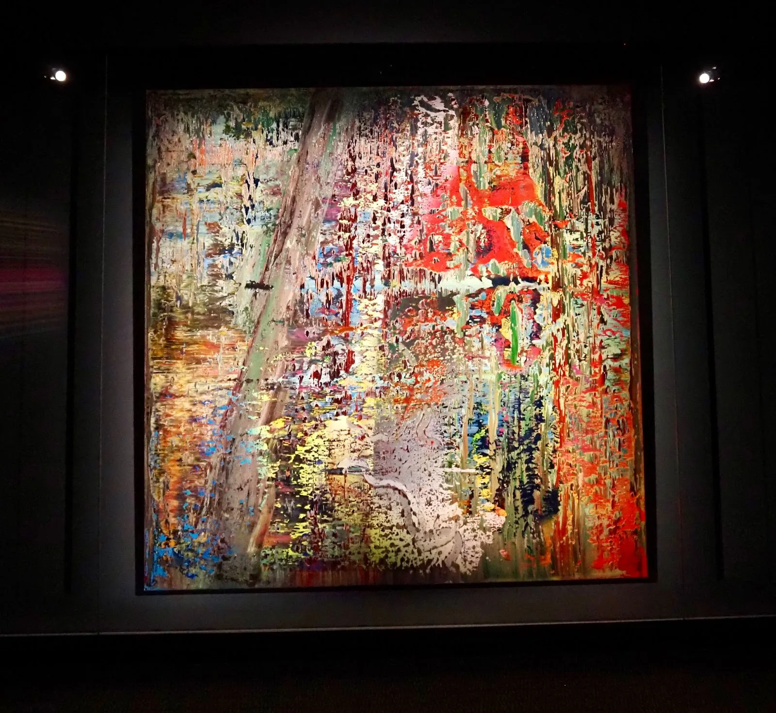 重要なのは、この作品で美しさをたたえている色が、《抽象絵画》に潜んでいたものだったことだ。リヒターは何を描くかよりもどう作るかを大切にしているという。おそらくリヒターは《抽象絵画》を見ていて美しい色の粒が多数含まれていることに気づき、手法を考案したのだろう。基になった《抽象絵画》とは別の作品だが、この作品は、ポーラ美術館が約30億円で購入して話題になった《抽象絵画(649-2)》、さらには、その淵源となったフォトペインティングシリーズの1枚《グレイ・ハウス》と同じ部屋で展示されており、そのあまりにも破天荒な変遷をたどることができる。