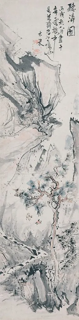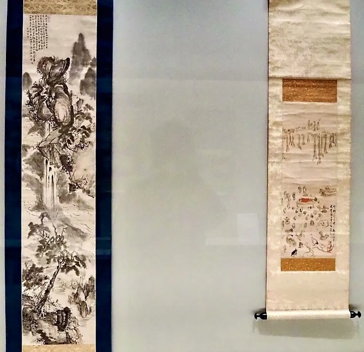 《松下煎茶図》は、楕円形と矩形を組み合わせた造形の中で流れ落ちながら途中で消える滝の描写の妙が魅力的だが、画面下部には人物が煎茶を楽しんでいる様子が小さく描かれている。ただし、かなり目を凝らさないとわからない。木米はほかにも煎茶の様子をさりげなく描きこんだ山水画を何枚も描いている。絵画では煎茶愛を強く主張するのではなく、さりげなく画面に仕込むのが木米の流儀だったのかもしれない。